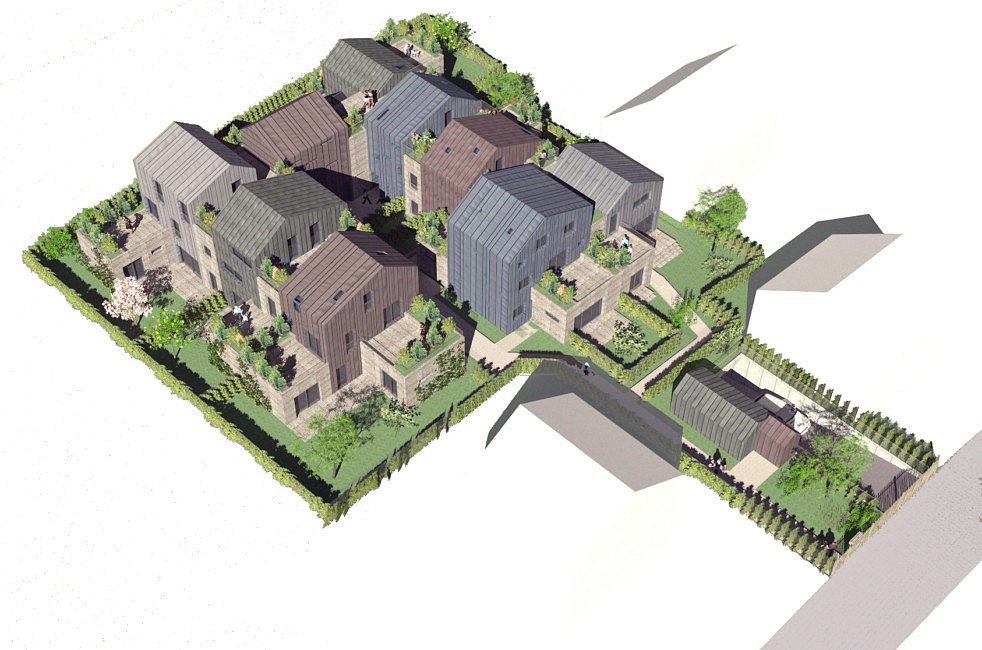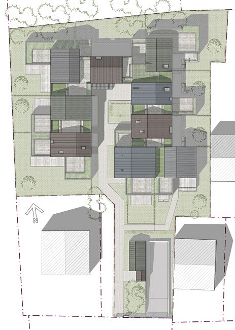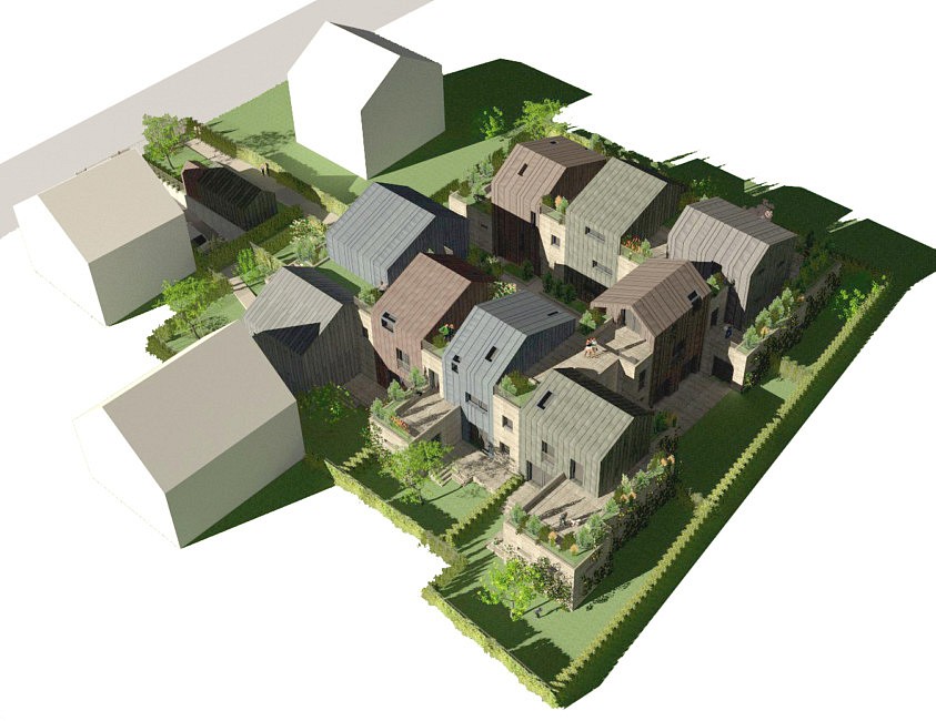 Les neuf habitations sont affirmées comme neuf entités variant sur le même thème : l’archétype de la maison familiale. Réalisées en zinc pré-patiné de couleurs et mises en œuvre différentes, elles sont reliées par des agrafes en bois. D’une densité relativement élevée, le projet offre à chacun des espaces extérieurs généreux et variés : jardins en pleine terre, terrasses minérales et/ou végétales. Grâce à l’aspect séquencé des constructions, la densité perçue est bien moindre depuis le voisinage, comme pour les habitants. Ce choix typologique permet aussi de développer des qualités proches de celles de la maison individuelle : dispositifs d’accès privatifs, intimité, volumes sous toiture, espaces extérieurs généreux.