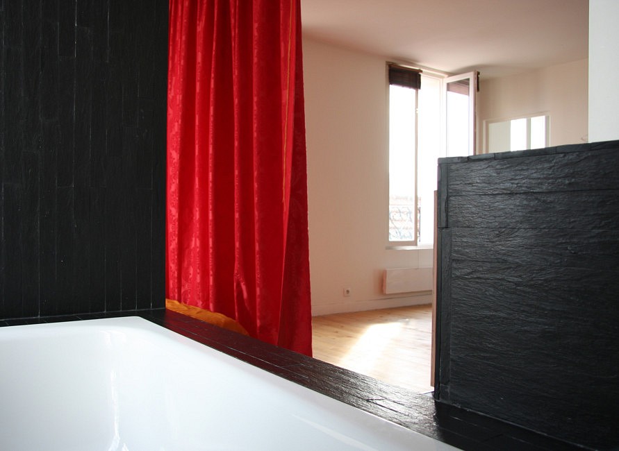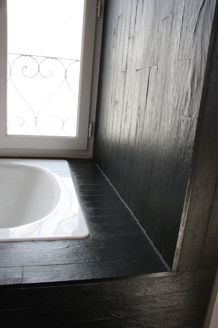 Le choix des matériaux : bois, ardoise noire et tissus donnent une certaine noblesse au lieu avec peu de moyens.