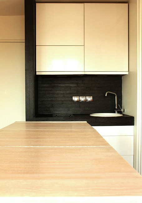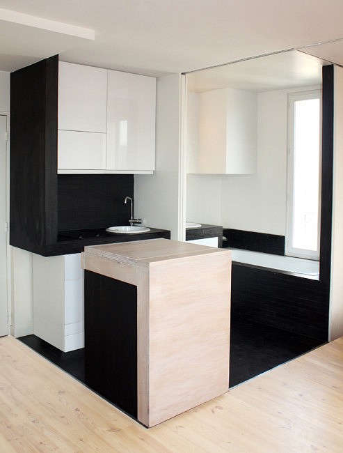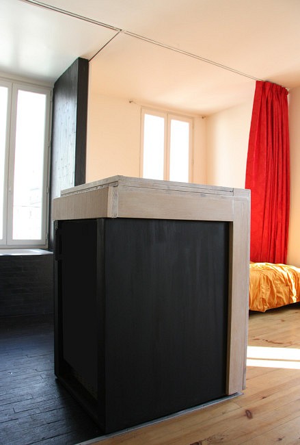 Le meuble central articule l’espace : en position plié il accueille uniquement le réfrigérateur ; en position intermédiaire, il peut accueillir 4 personnes ou servir de plan de travail ; entièrement déployé, il peut recevoir 8 à 10 personnes.