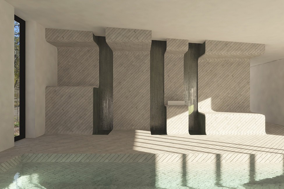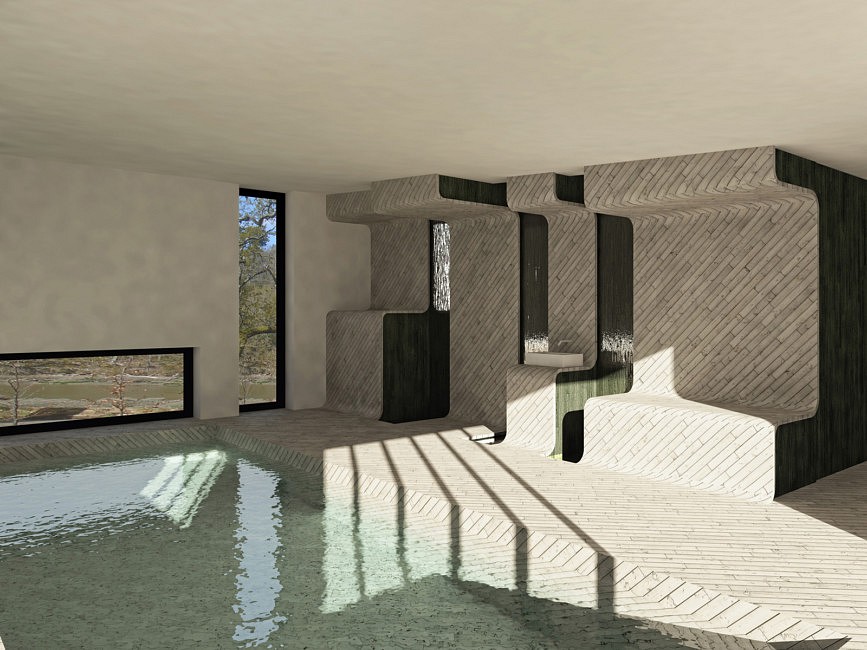 Bassin de nage dans un cadre exceptionnel : entre mer et rivière, au cœur de la forêt, le projet en parti induit par cette situation. Les mouvements naturels : ascensionnel de la sève des arbres et gravitaire de l’écoulement de la rivière vers la mer ont inspiré la morphologie du lieu.