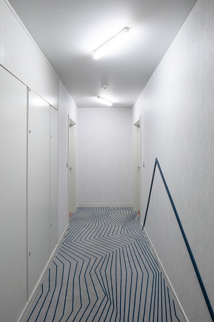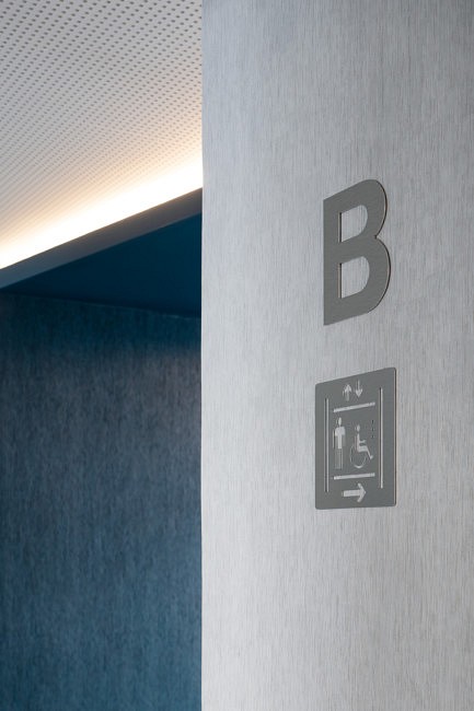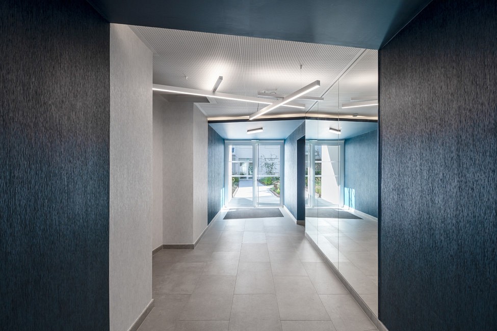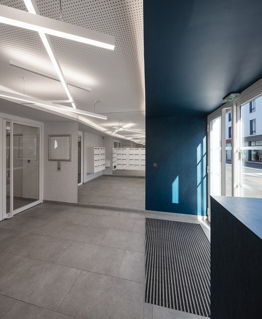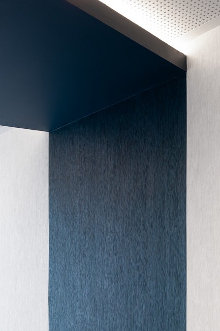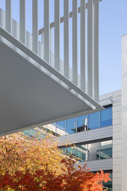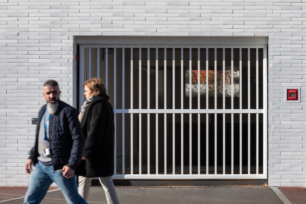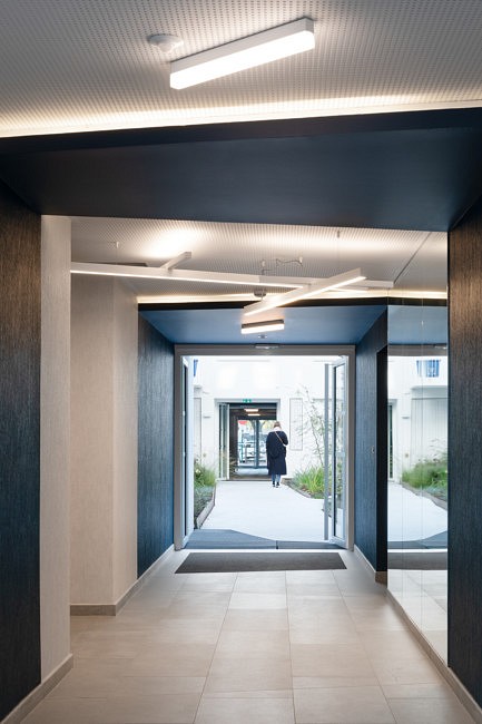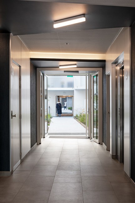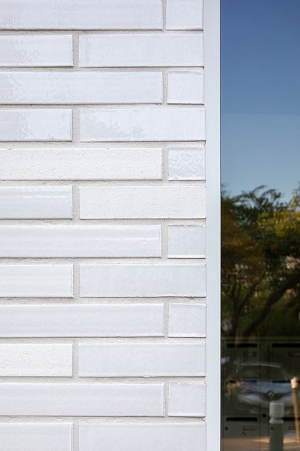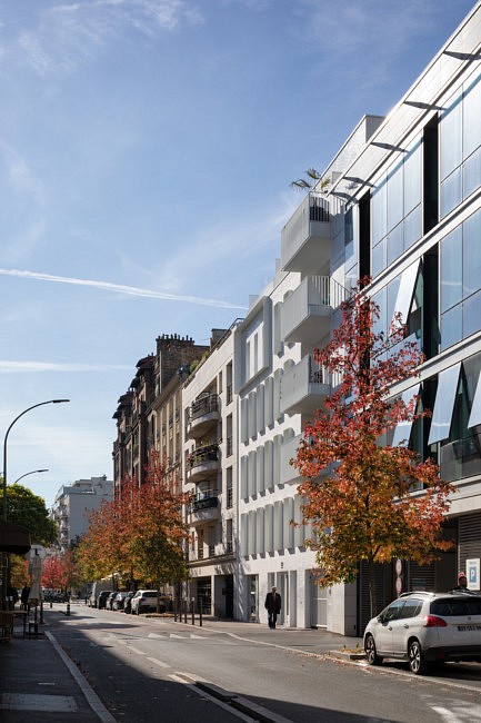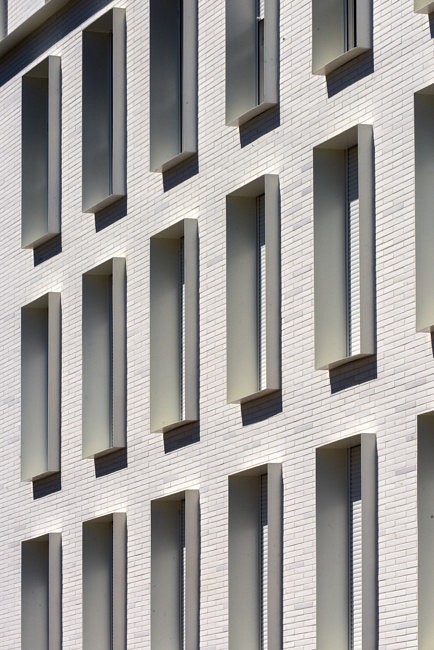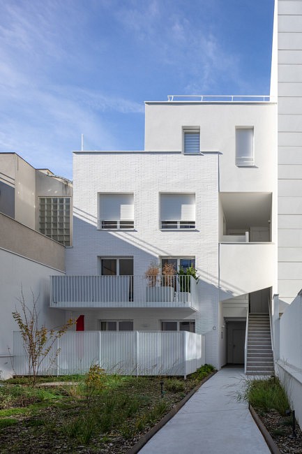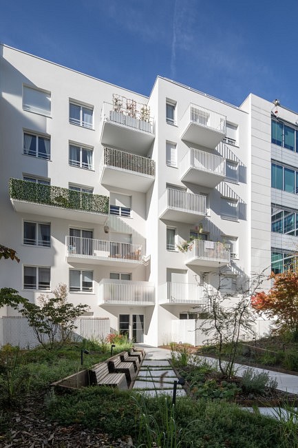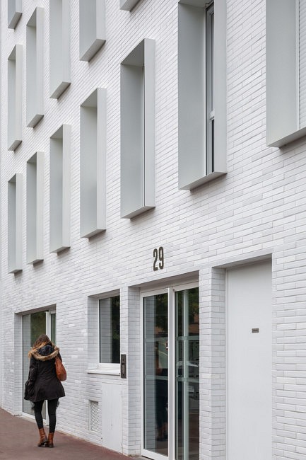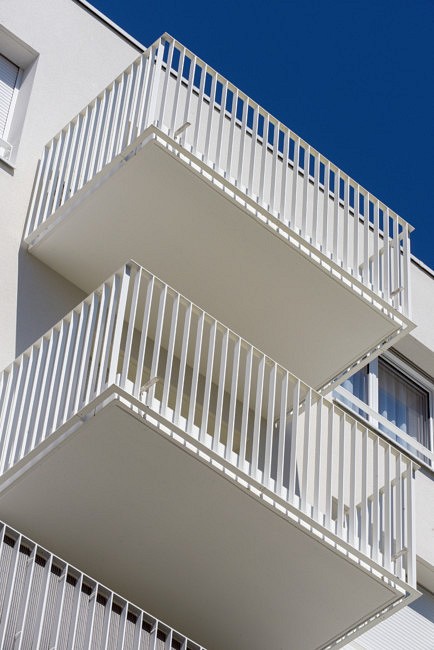 Des cadres saillants métalliques laqués blancs encadrent les fenêtres afin de souligner l’ordonnancement de la façade tandis que le barreaudage des garde-corps des balcons marquent sa verticalité. Sur cour, la disposition aléatoire des balcons confère aux façades en enduit lisse blanc un rythme ludique en contraste avec l’ordonnancement régulier des ouvertures.