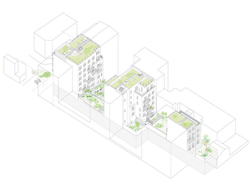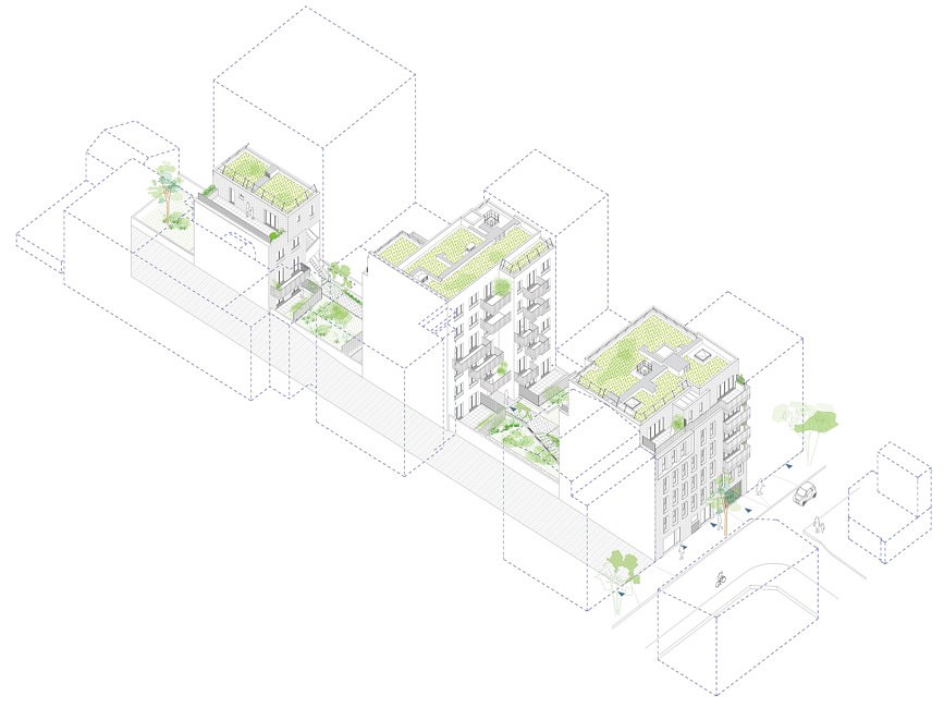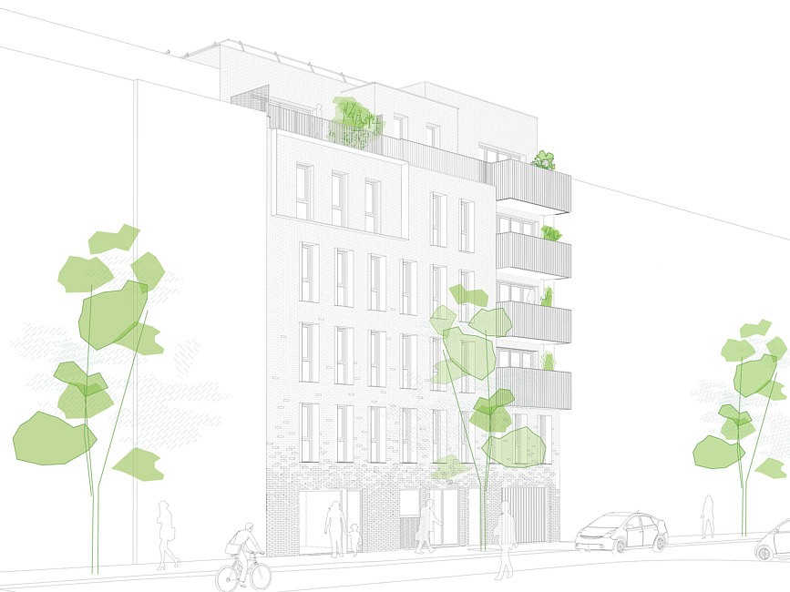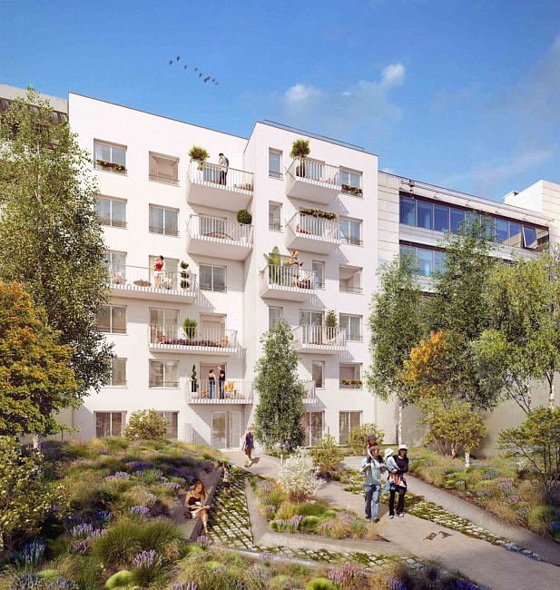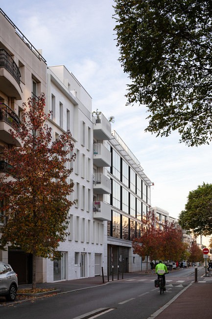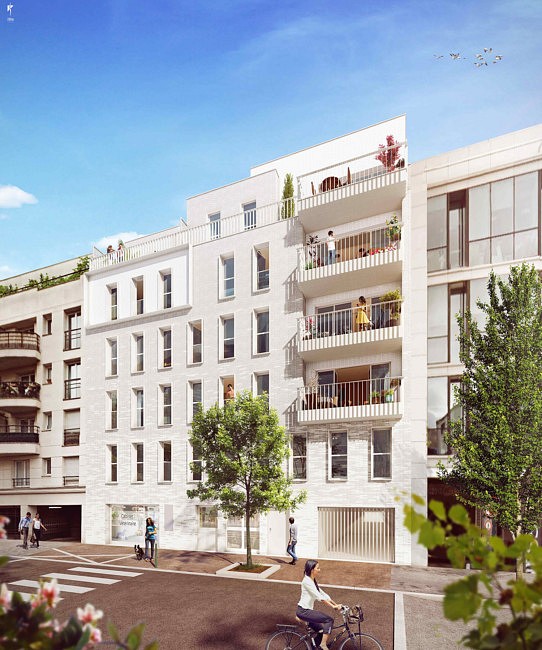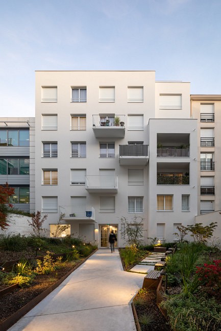 Pensées comme un ensemble sobre et soigné, les constructions s’insèrent dans le bâti existant en s’appuyant sur les gabarits des constructions. Le projet présente sur la rue de Verdun une façade élégante traitée en plaquettes de parement en terre cuite blanche. Brillantes en soubassement elles se dispersent sur la façade mate et les balcons pour attraper la lumière.