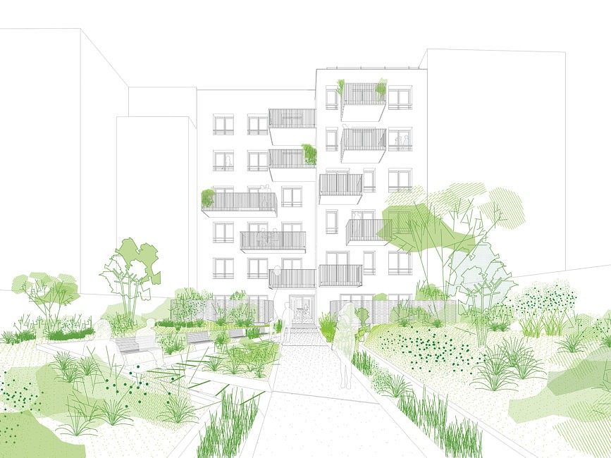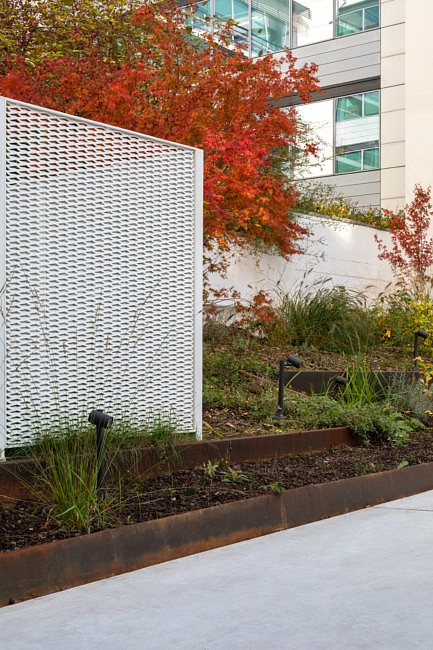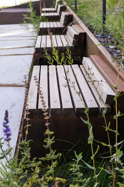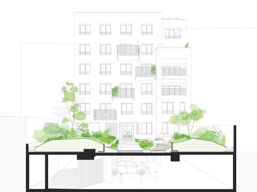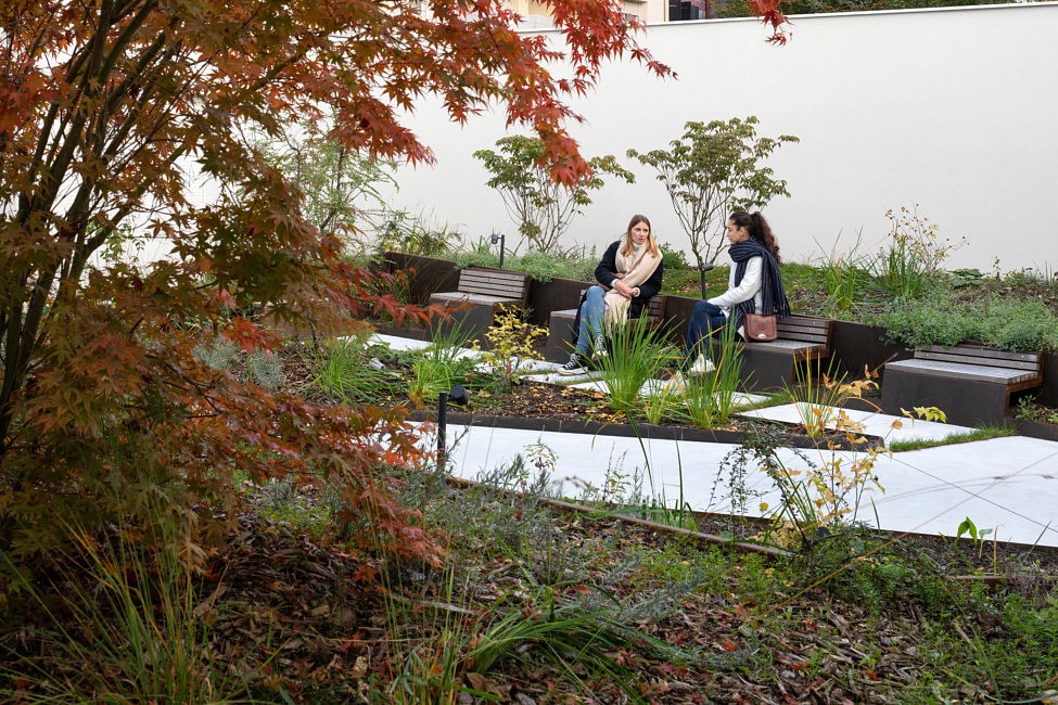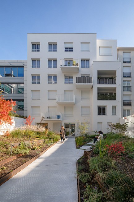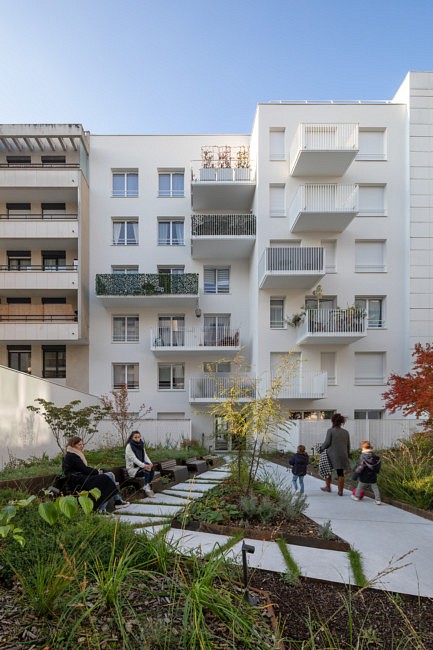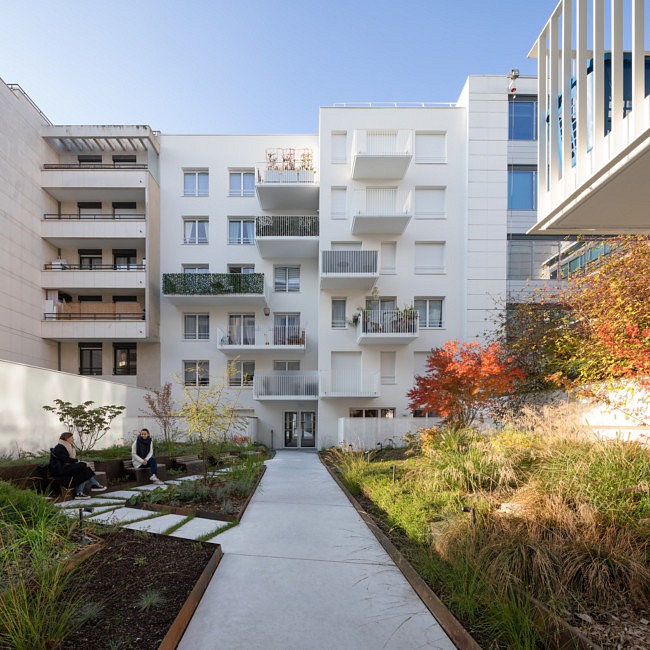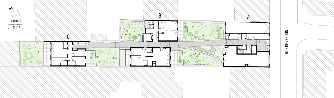 Entre les trois bâtiments se développent des jardins collectifs aux ambiances inattendues qui communiquent entre eux par de vastes circulations. Sur les dalles des parkings enterrés, un jeu de pentes avec la terre végétale permet des plantations plus hautes. Espace de détente avec des bancs intégrés à la géométrie du lieu, le jardin sert aussi à dégager ou masquer certaines vues depuis les terrasses privatives et marquer l’échelle du lieu.