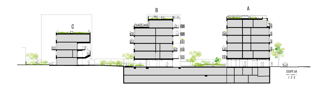 Le projet prévoit la construction de 37 logements collectifs en accession avec un local commercial réparti sur trois bâtiments.