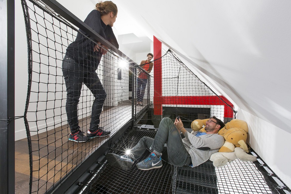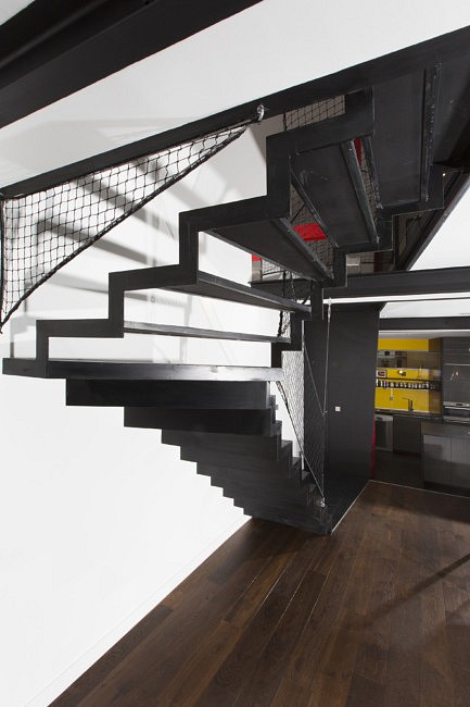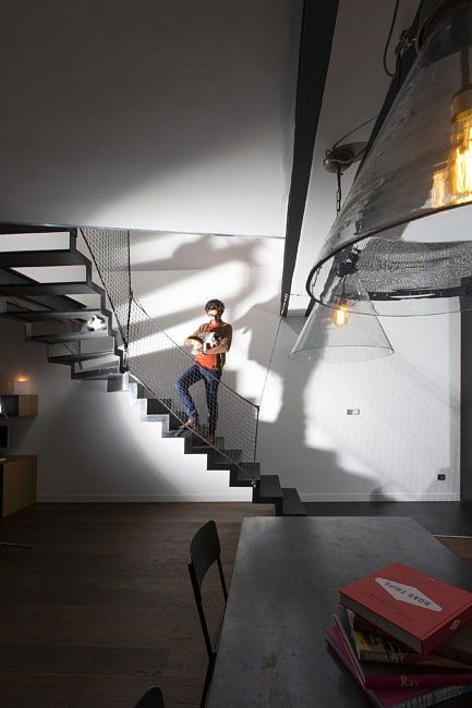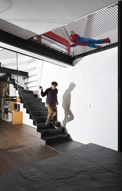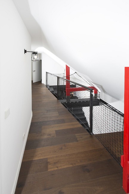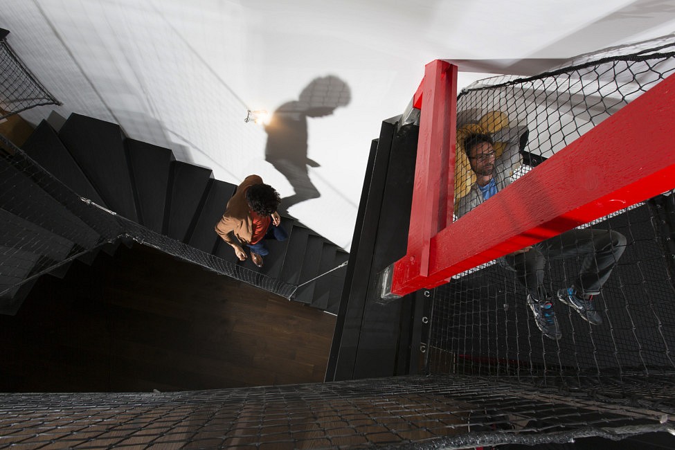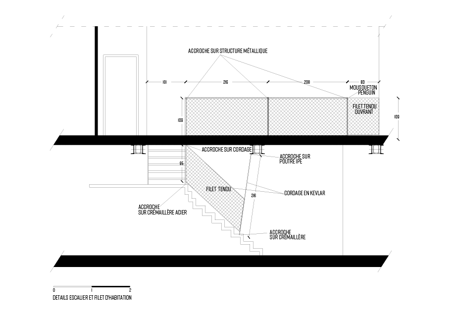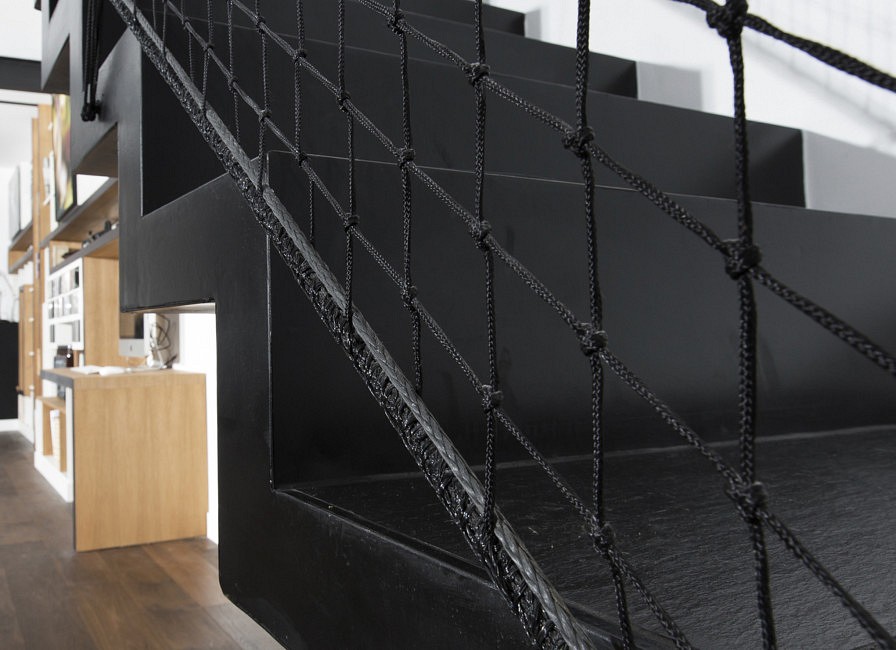 A travers ce volume libre, serpente un ruban noir, de l’entrée jusqu’à l’étage, enveloppant l’événement du lieu : le filet d’habitation, observatoire et lieu de détente, suture entre les deux niveaux. Les garde-corps de l’escalier et de la trémie sont eux-aussi traités en filets textiles montés sur des cordages en kevlar, conférant souplesse et légèreté visuelle à l’ensemble.
