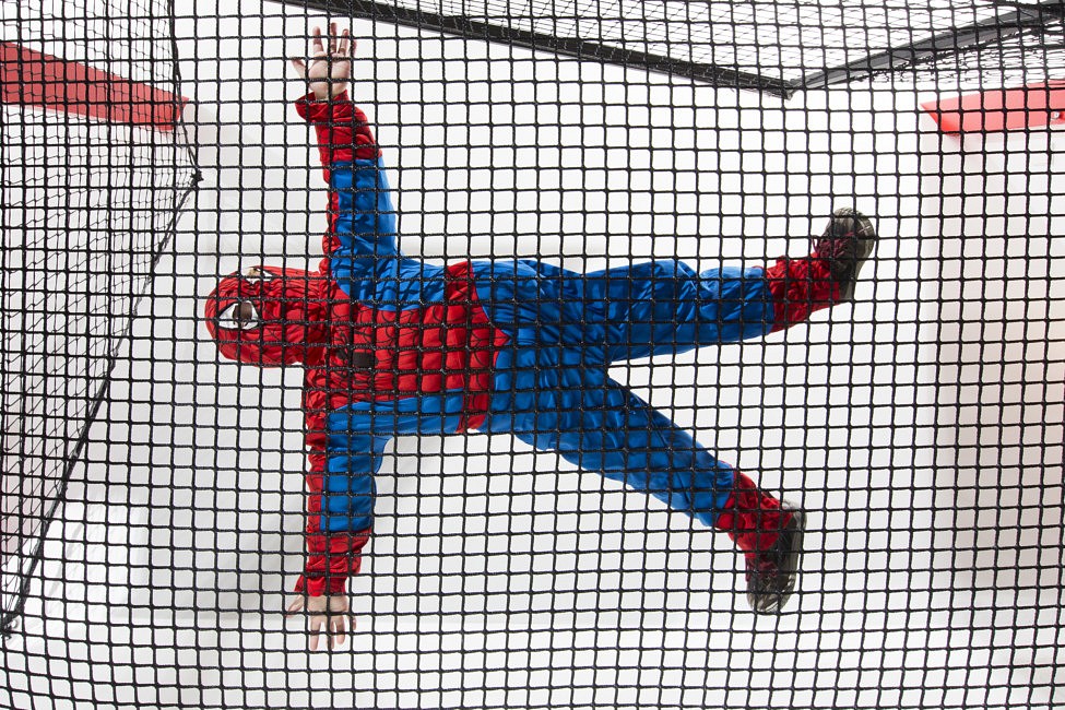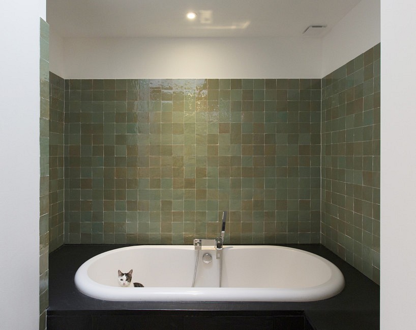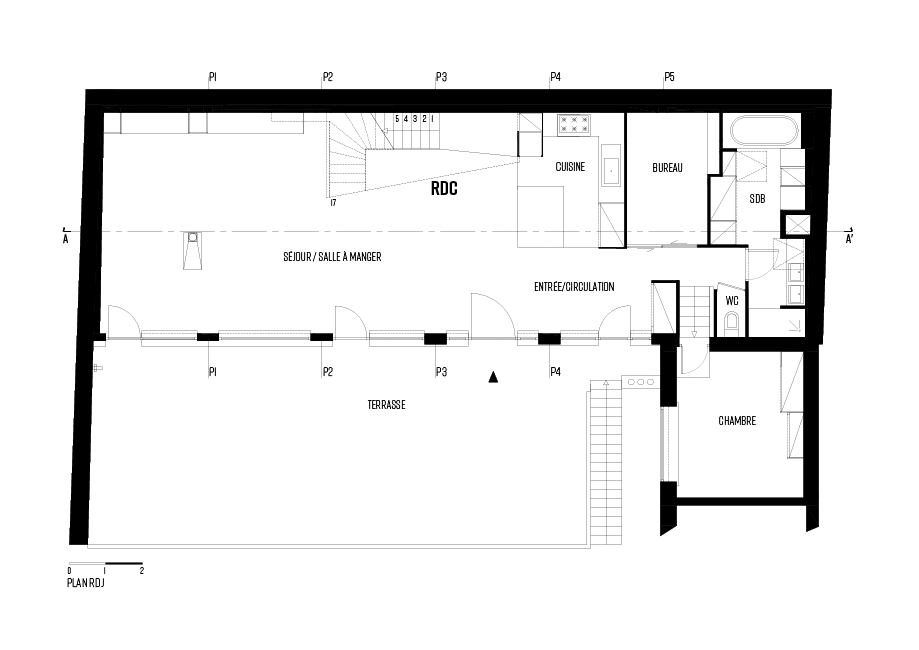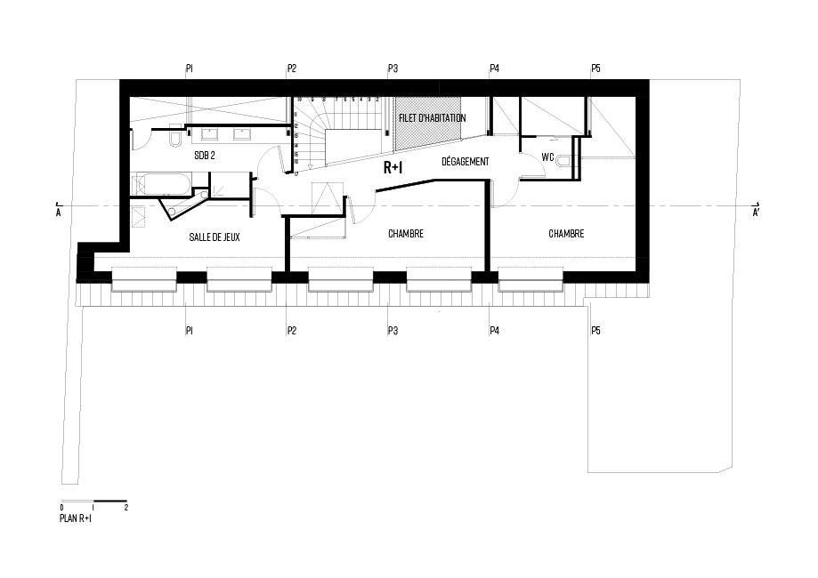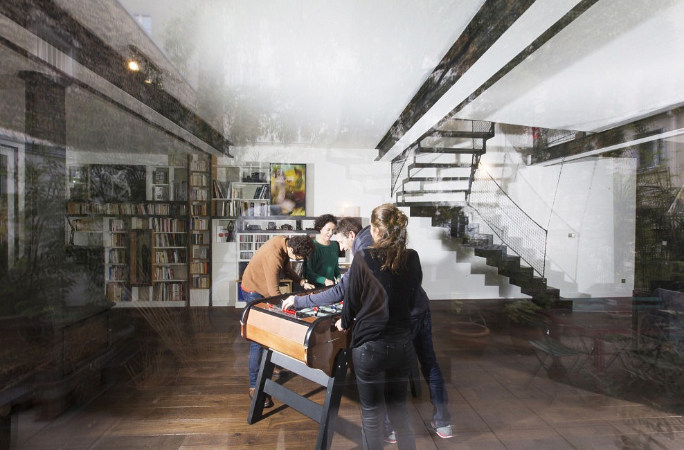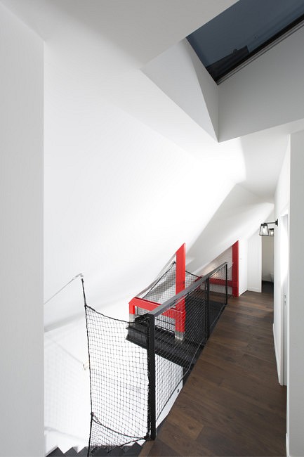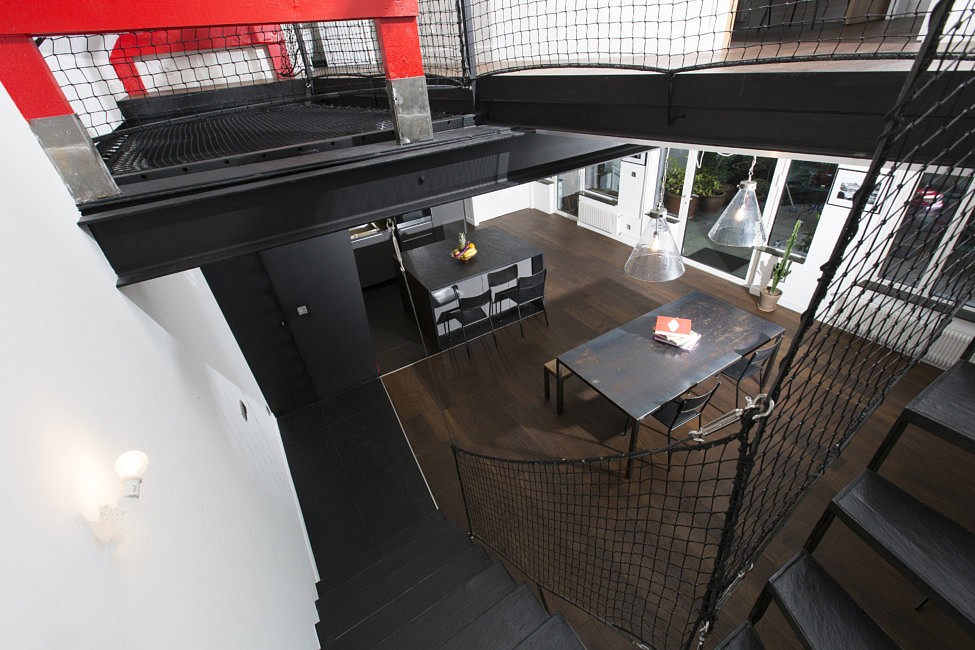 A travers ce volume libre, serpente un ruban noir, de l’entrée jusqu’à l’étage, enveloppant l’événement du lieu : le filet d’habitation, observatoire et lieu de détente, suture entre les deux niveaux. Les garde-corps de l’escalier et de la trémie sont eux-aussi traités en filets textiles montés sur des cordages en kevlar, conférant souplesse et légèreté visuelle à l’ensemble.