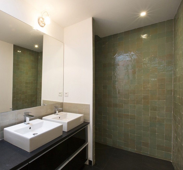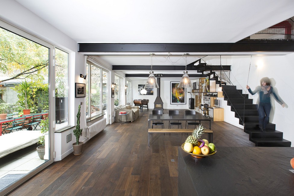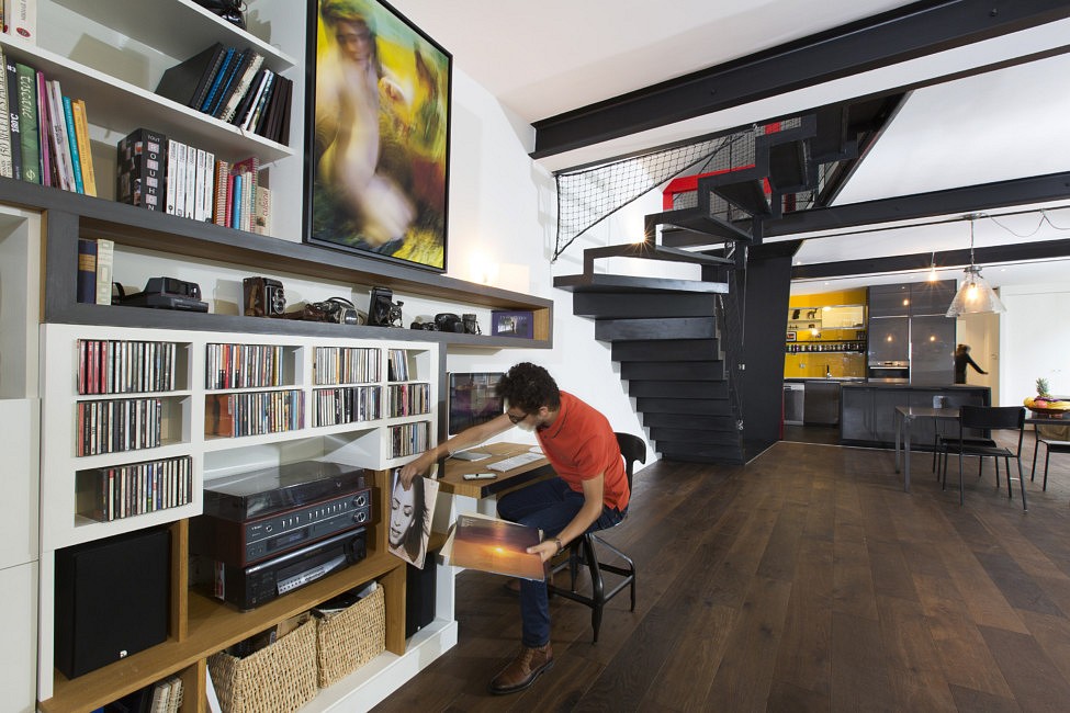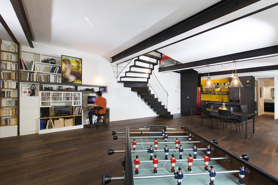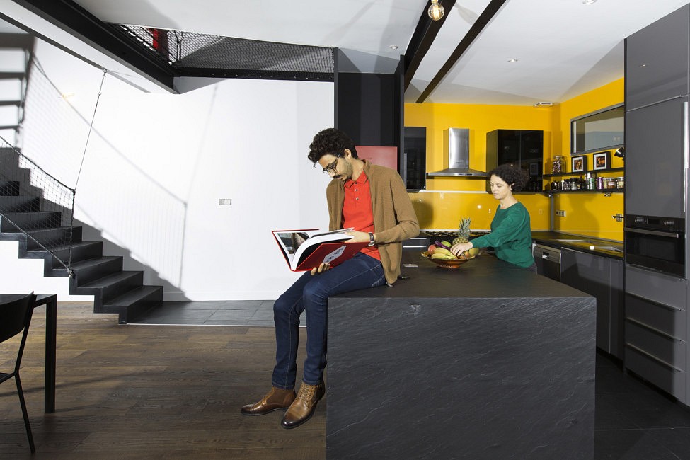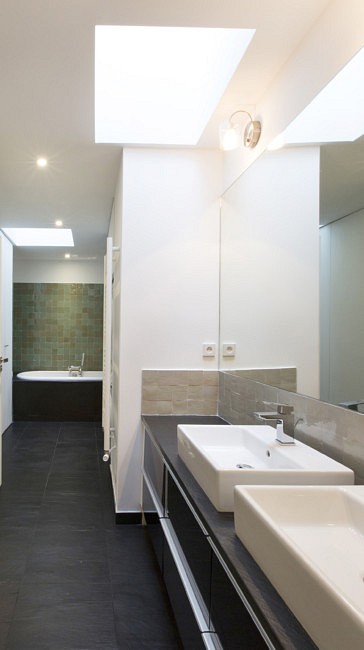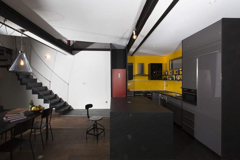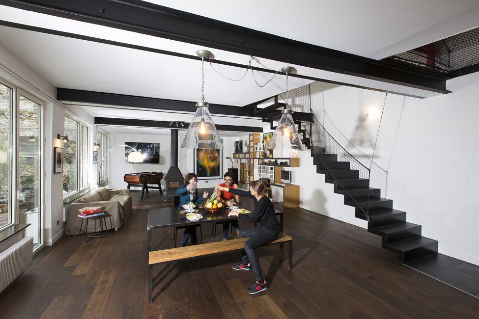 Dans une ancienne bonneterie, ce « loft » a été entièrement réhabilité, avec l’objectif de rendre à l’espace sa générosité originelle. Précédemment encombrés de nombreux séparatifs, il a été décidé de décloisonner largement le volume afin d’offrir de longues perspectives, séquencées par les poutres en acier soulignées de noir.