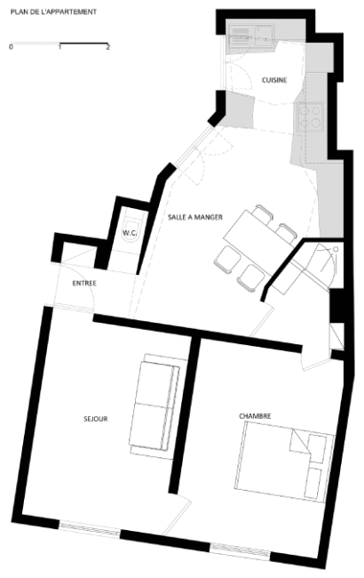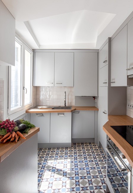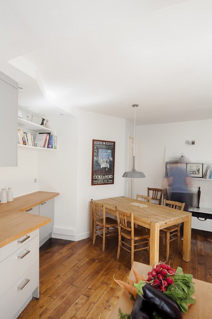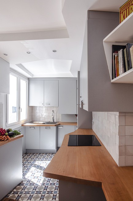 Lors de cette restructuration d’appartement, l’objectif poursuivi fut de mettre en valeur les existants. La géométrie complexe, voir alambiquée, caractéristique des immeubles pré-haussmannien est souvent perçue comme un handicap. Ici, il a été choisi d’en tirer parti pour « envelopper » l’espace par un jeu de lignes brisées aux directions multiples : plans de travail, jeu de faux-plafonds et mobilier renforce cette dynamique. Les matériaux : bois, carreaux de ciment, zelliges, ont été choisis pour leur aspect artisanal, prolongeant le caractère du bâti existant.