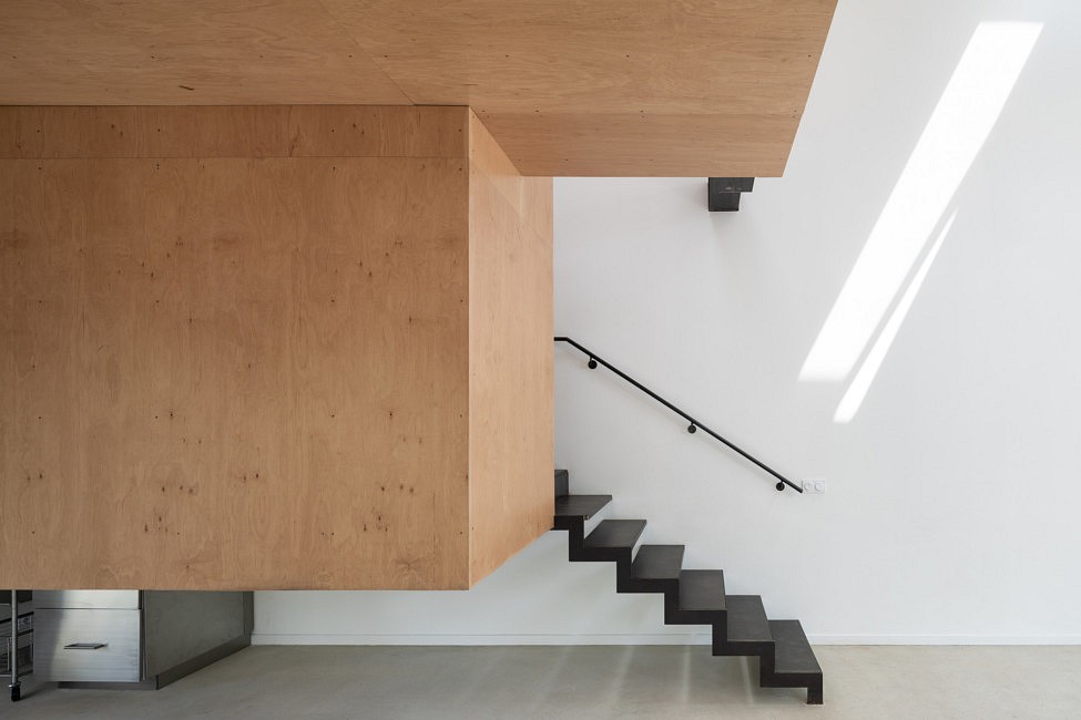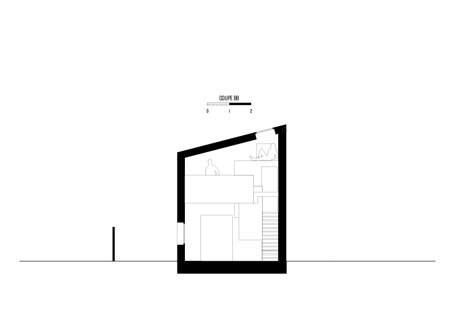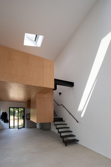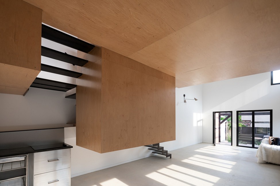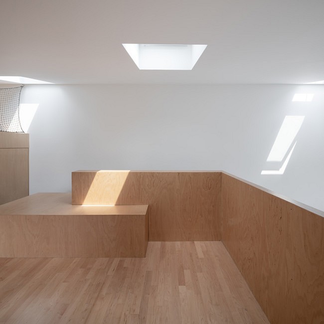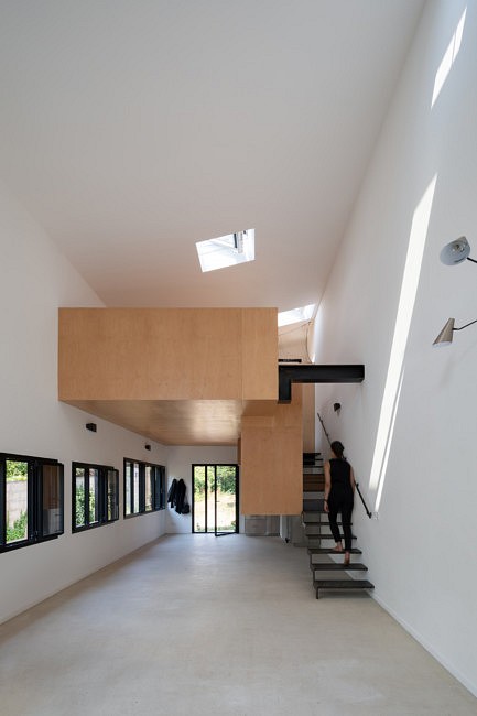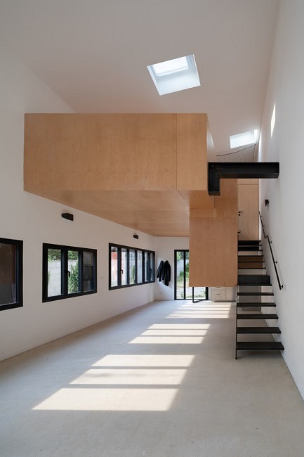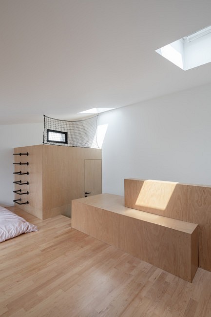 Le volume généreux obtenu par cette surélévation, portant la hauteur sous plafond à plus de six mètres, est volontairement préservé. des boîtes pensées comme des cabanes en boie sont suspendus à des niveaux variées. Ces boîtes accueillent les programmes fermés (salle de bain et WC) ainsi qu une chambre mezzanine et une niche de jeu.