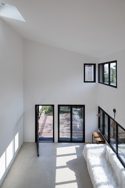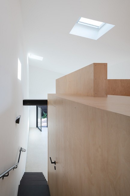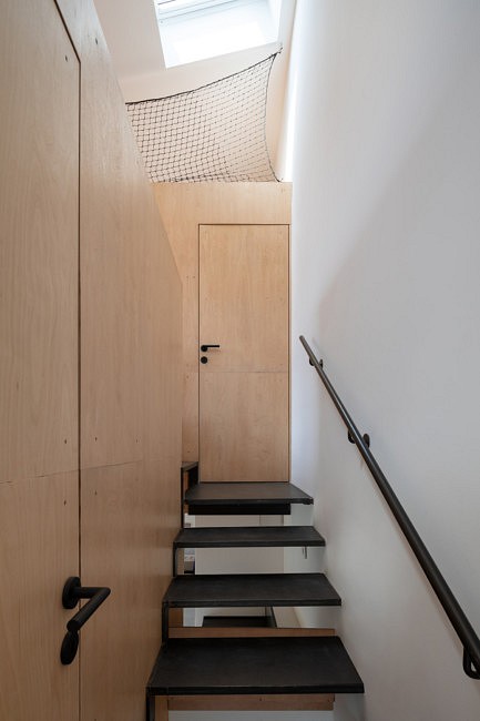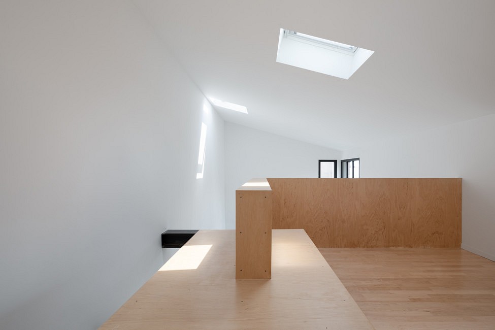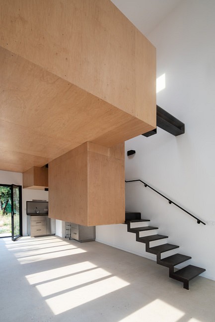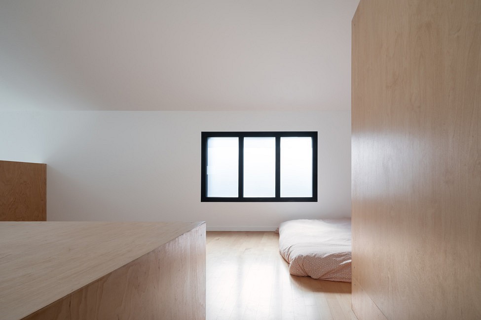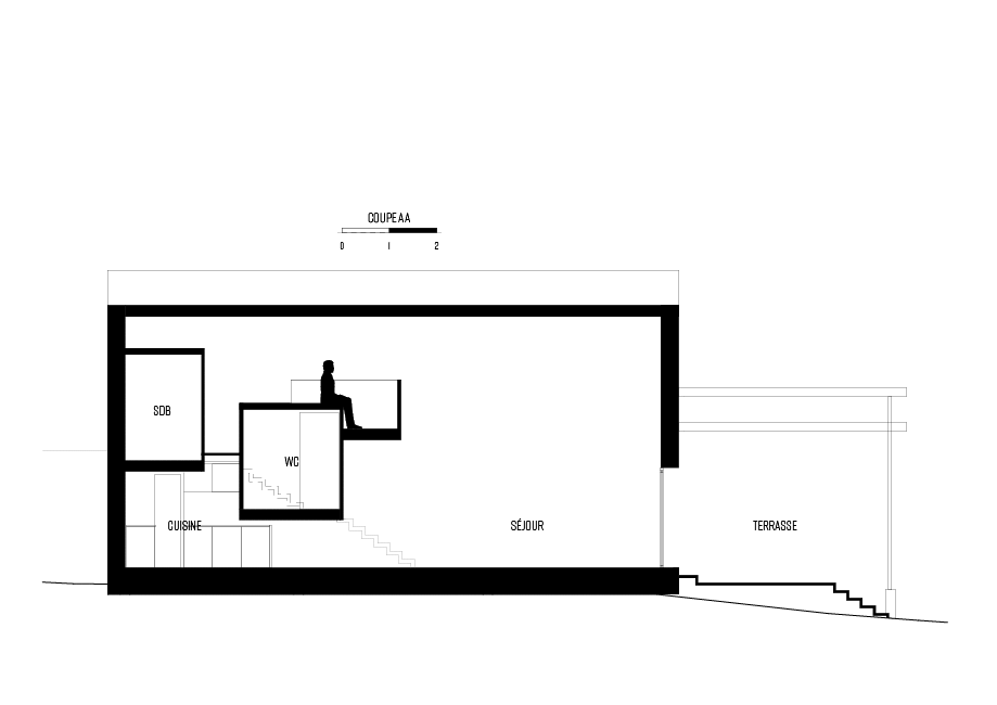 Le volume généreux obtenu par cette surélévation, portant la hauteur sous plafond à plus de six mètres, est volontairement préservé. des boîtes pensées comme des cabanes en boie sont suspendus à des niveaux variées. Ces boîtes accueillent les programmes fermés (salle de bain et WC) ainsi qu une chambre mezzanine et une niche de jeu.