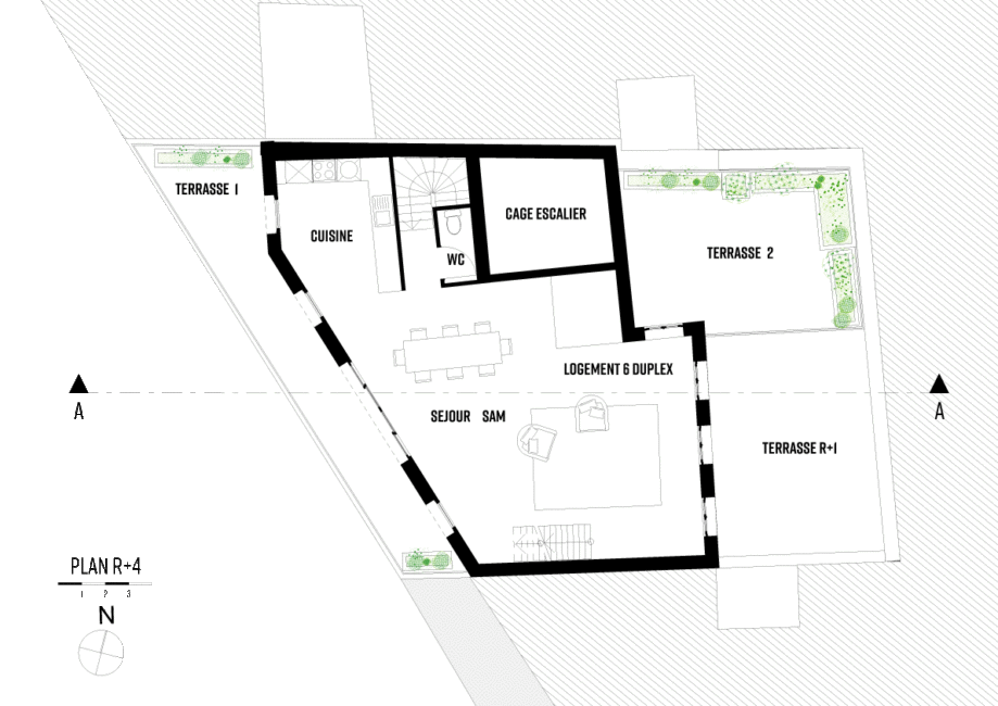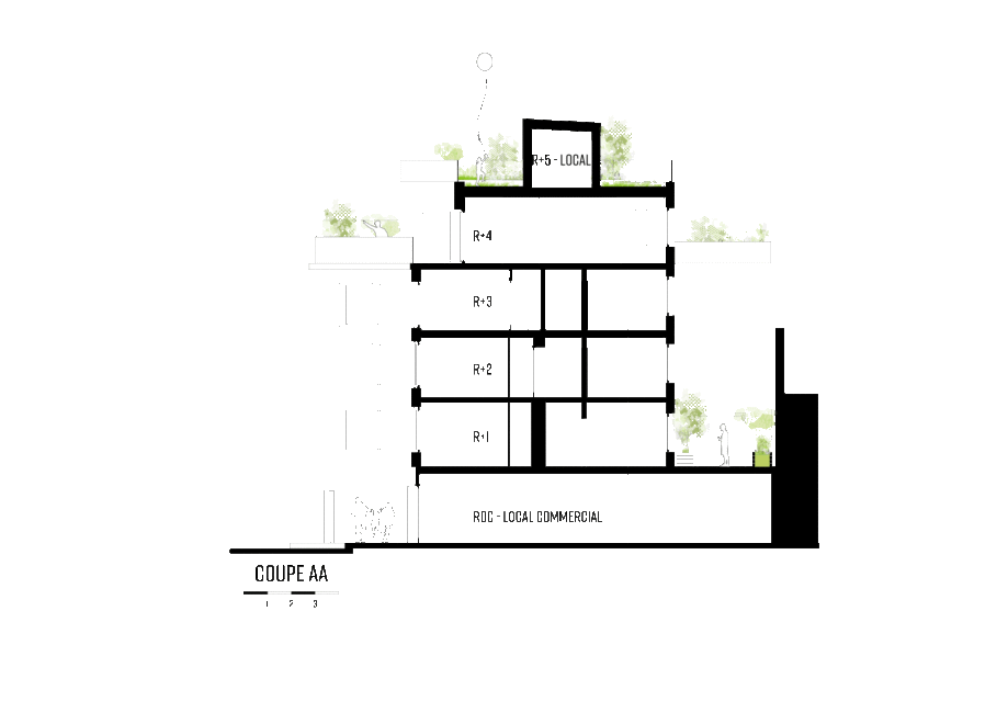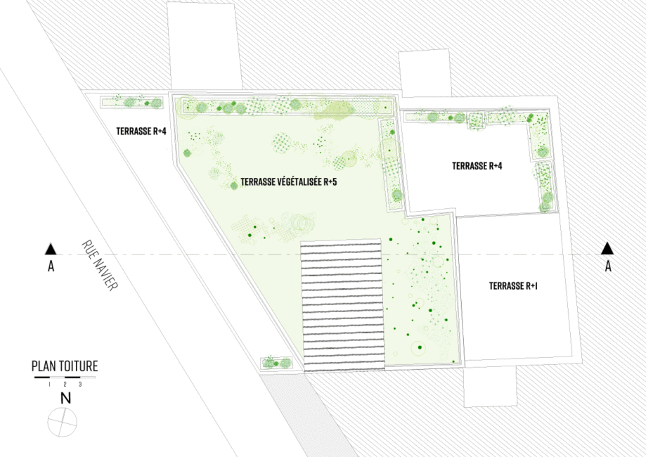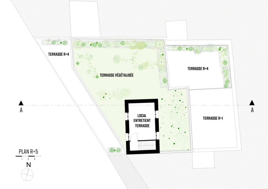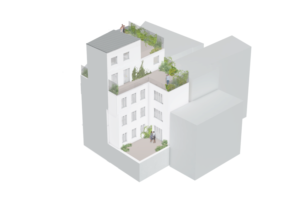 Ce travail de plis multiples en surélévation introduit plusieurs niveaux d’espaces extérieurs, respirations bienvenues dans un tissus urbain parisien dense. Une attention particulière est apportée à la végétalisation du bâti, non pas comme décor végétal mais comme outil de distinction des espaces et d’intimité, la toiture végétalisée au R+5, d’une superficie de 60m² permet la rétention des eaux et contribue au biotope parisien.