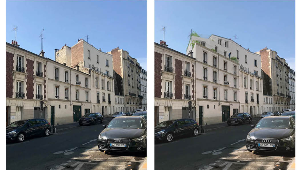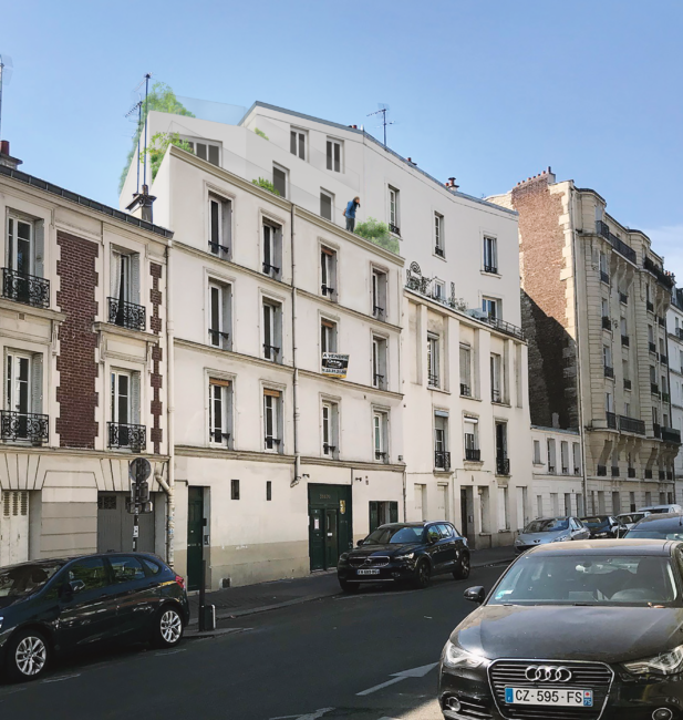 Inscrite dans une séquence urbaine particulièrement hétéroclite, le projet joue avec une surélévation voisine existante singulière. Le projet de surélévation permet ici de, non seulement masquer un mur pignon particulièrement imposant induit par la surélévation voisine, mais, également, introduire une transition douce et ludique dans la séquence urbaine.