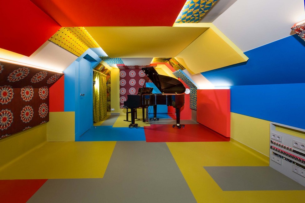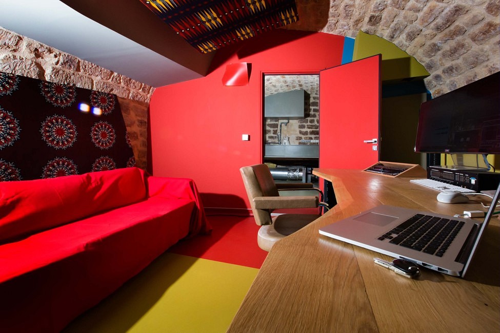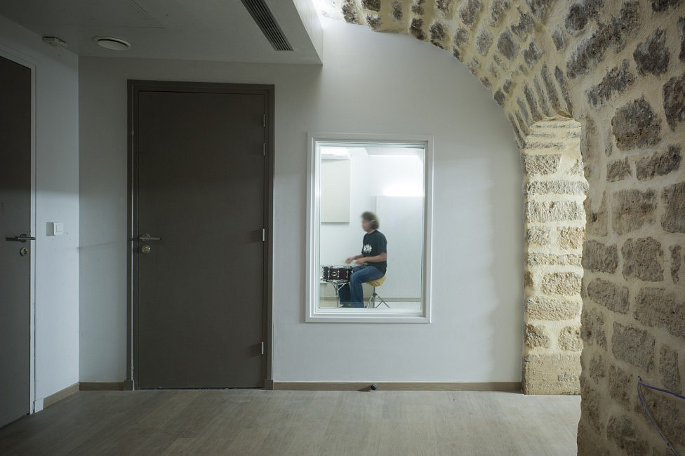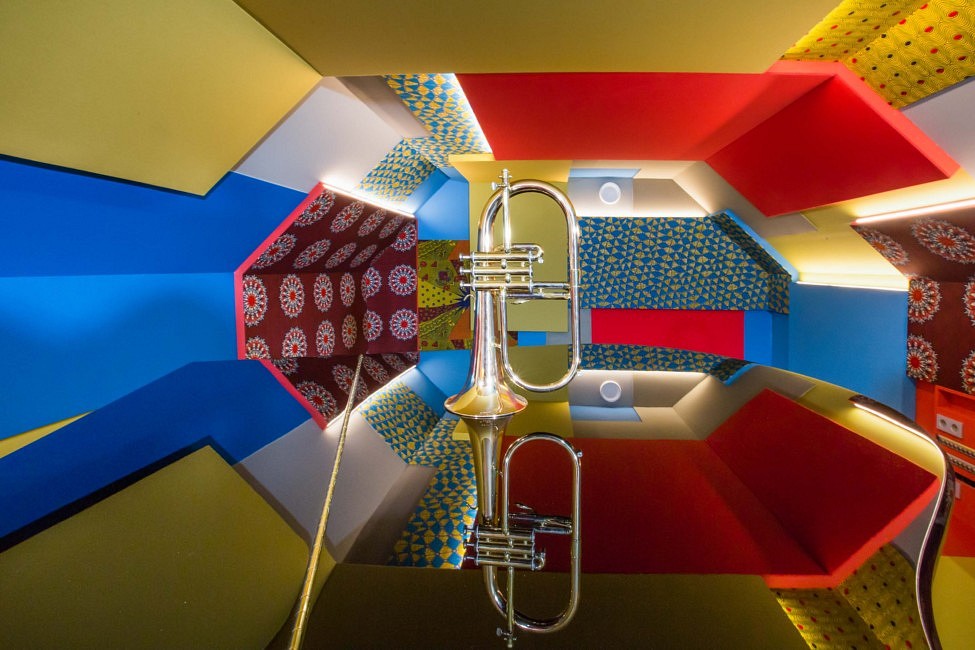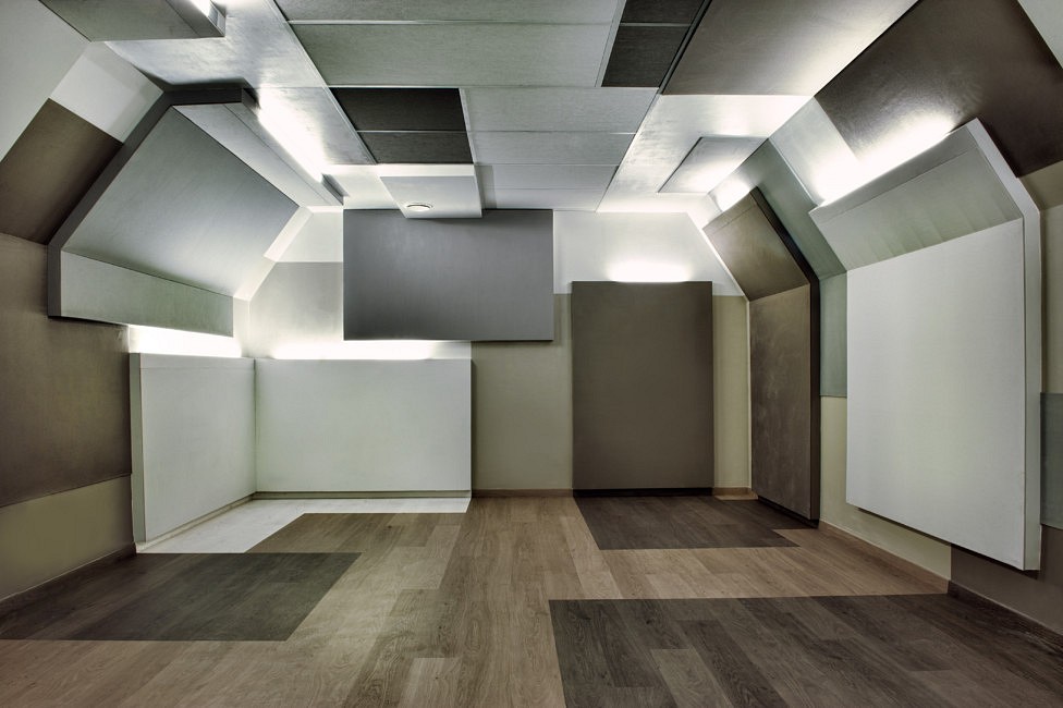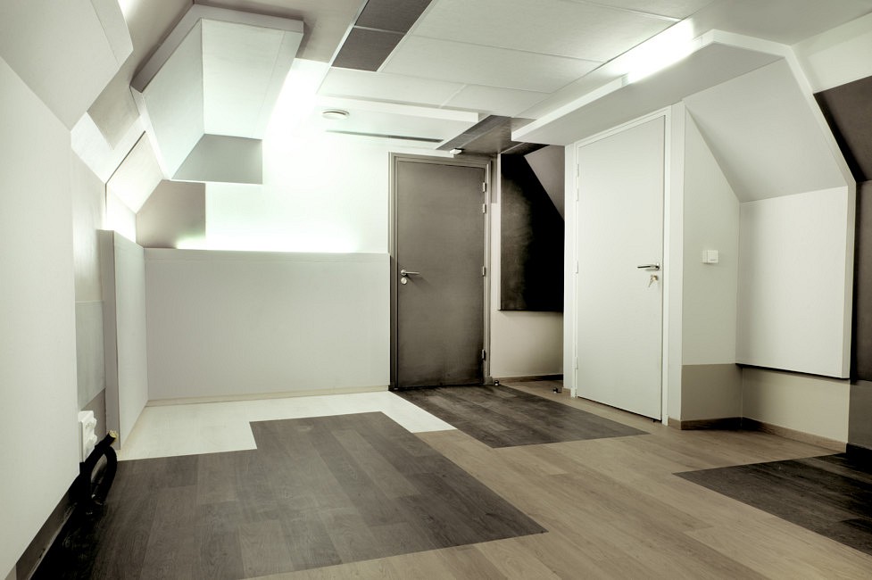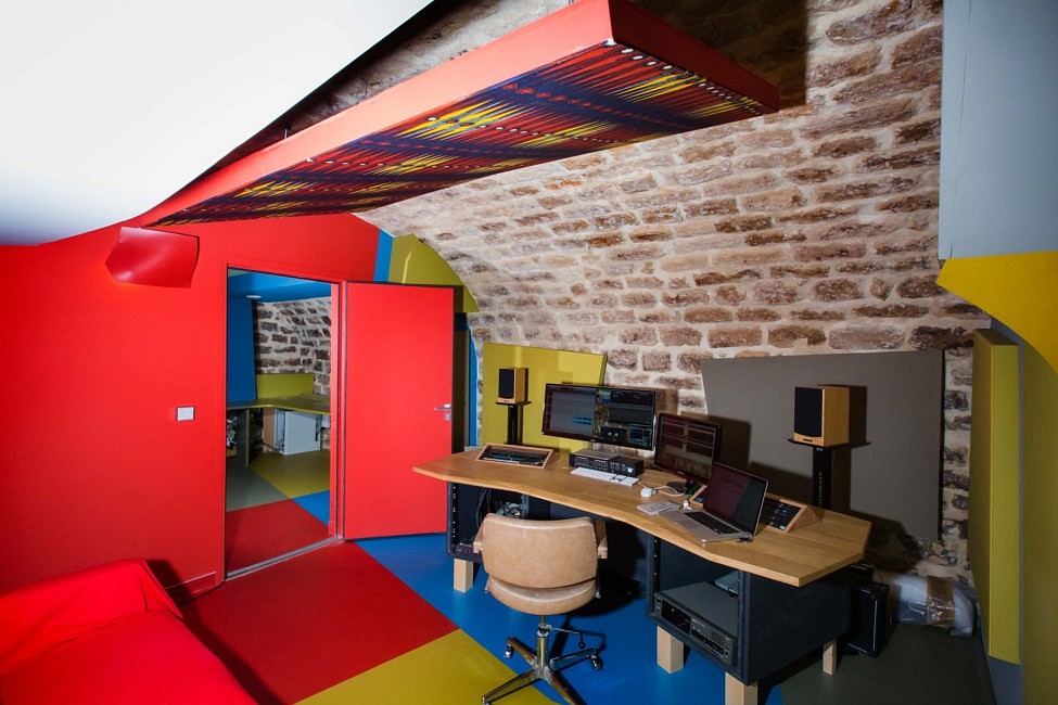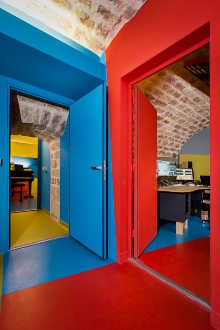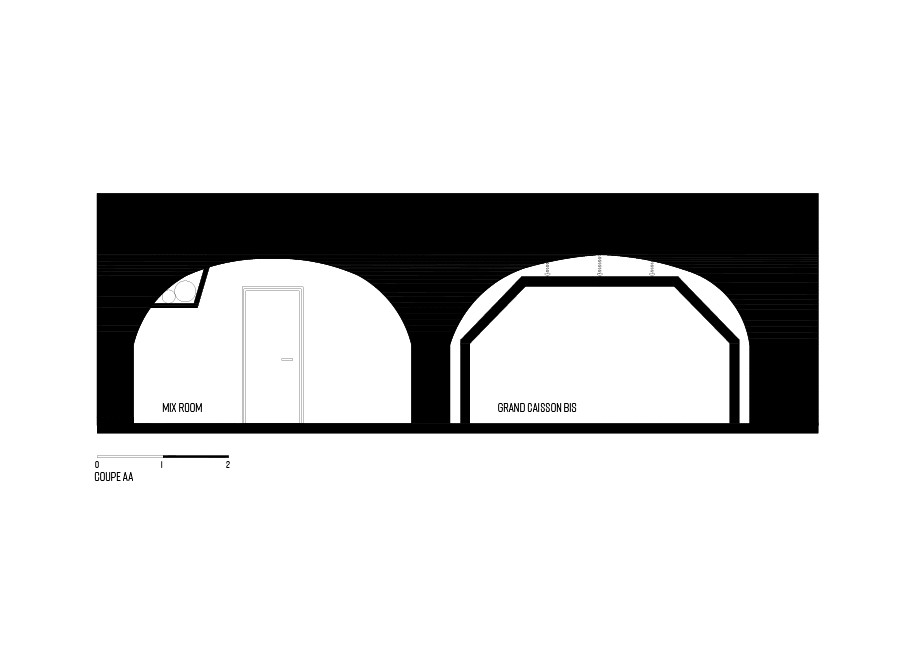Cette transformation de caves en studios de répétition de musique fut une expérience architecturale particulière, entre haute technicité et recherche décorative au sens noble. Situés sous un immeuble d’habitation, l’objectif premier était bien-entendu la performance acoustique (isolation et qualité de l’ambiance sonore) Des « boîtes dans la boîte » suspendues aux voûtes en pierre ont été réalisées. Outre la performance technique, il était aussi indispensable d’inventer une ambiance visuelle stimulante pour ces lieux de création.