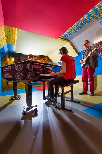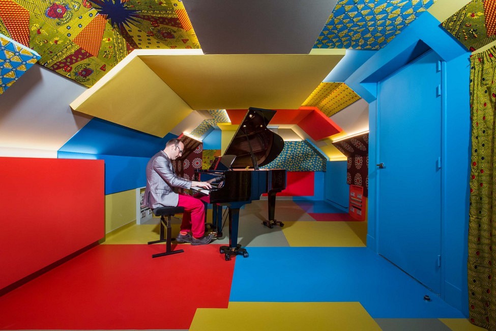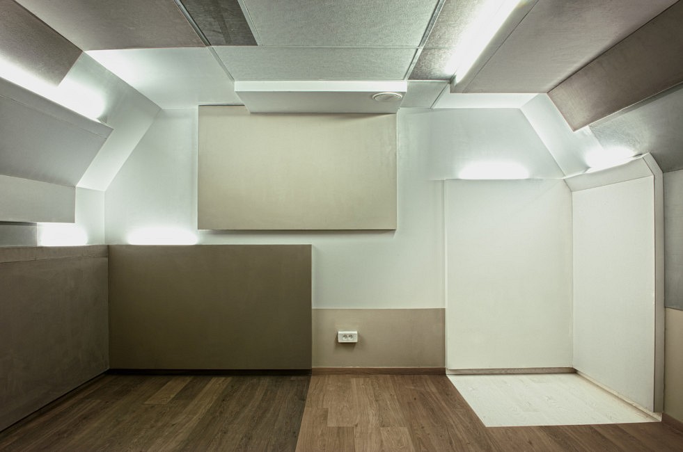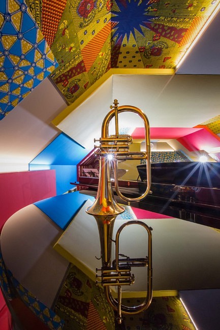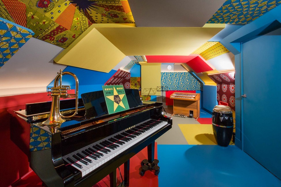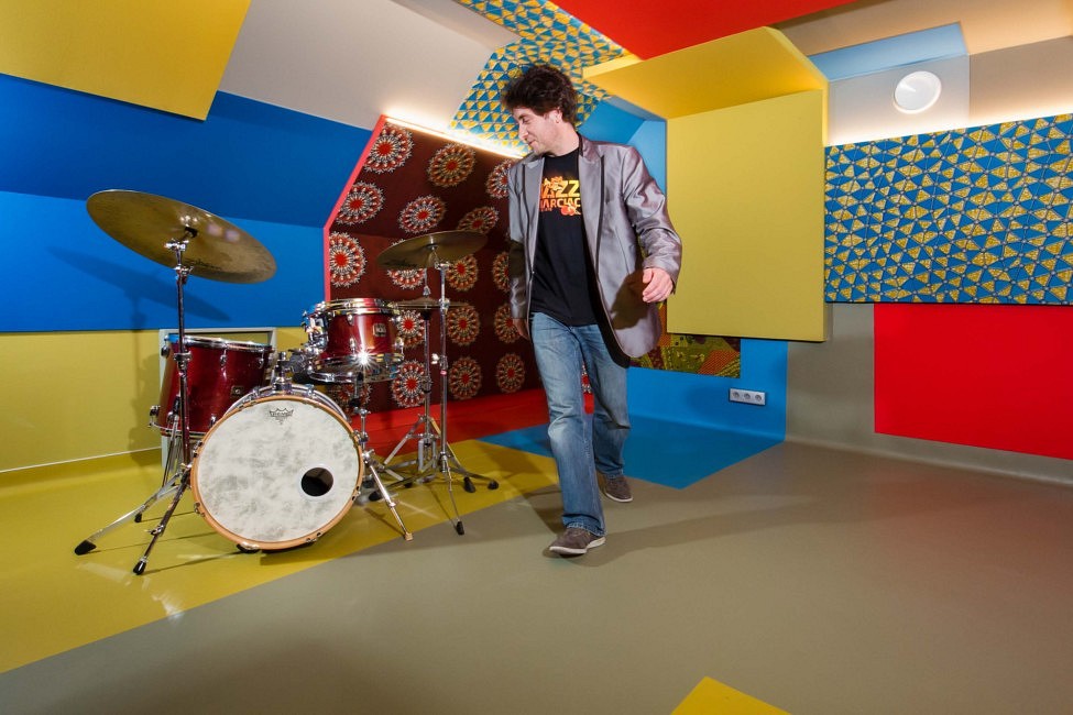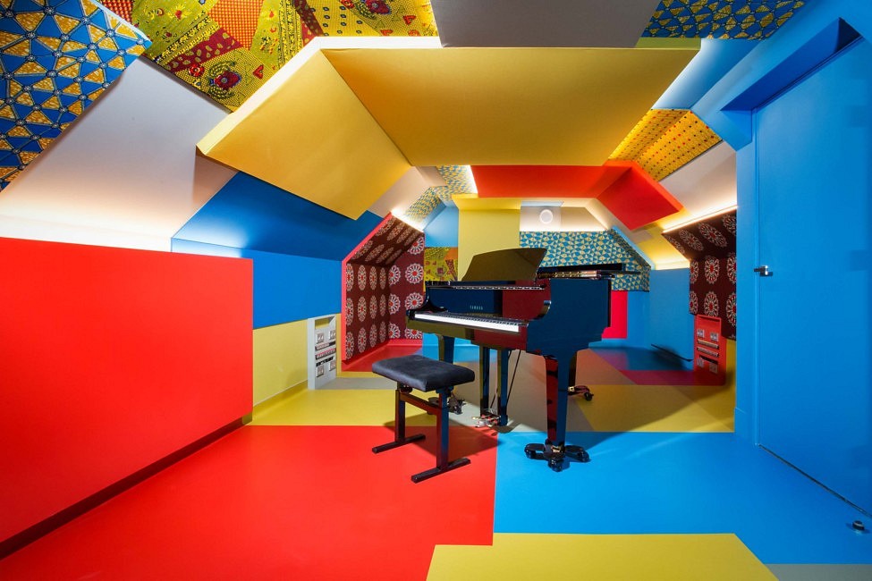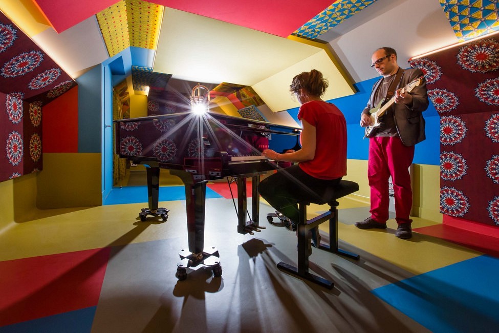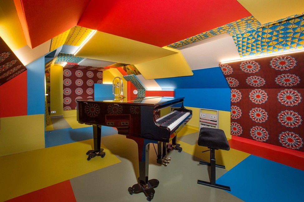 Cette transformation de caves en studios de répétition de musique fut une expérience architecturale particulière, entre haute technicité et recherche décorative au sens noble. Situés sous un immeuble d’habitation, l’objectif premier était bien-entendu la performance acoustique (isolation et qualité de l’ambiance sonore) Des « boîtes dans la boîte » suspendues aux voûtes en pierre ont été réalisées. Outre la performance technique, il était aussi indispensable d’inventer une ambiance visuelle stimulante pour ces lieux de création.