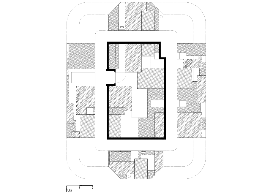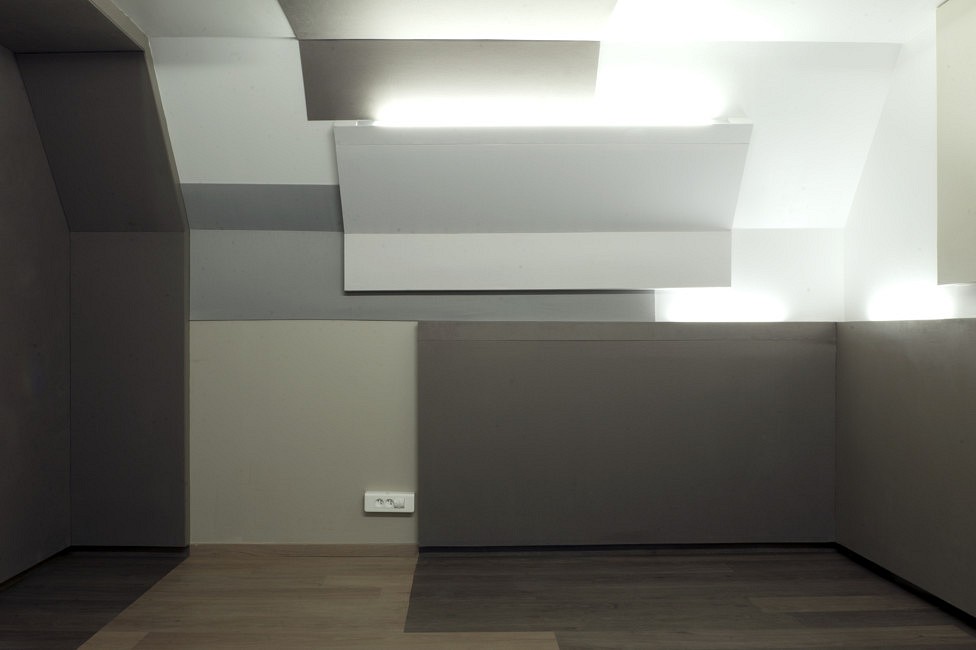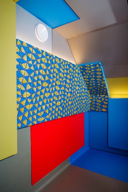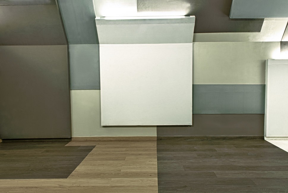 La particularité intrinsèque de ces espaces est qu’ils sont coupés de leur contexte, ni vues, ni vent, ni sons extérieurs ne les animent. La « décoration » n’est alors plus accessoire, elle caractérise l’espace. La morphologie globales des caissons ( boites dans la boite) étant largement contrainte , d’une géométrie monotone, « quasi-militaire » , il fallait trouver le moyen d’y apporter une dimension ludique. La proposition du « patch-work », combinaison de « taches » se prolongeant sur murs, sols et plafonds, brouille les repères, déconstruit l’espace, sorte d’anamorphose, il dynamise le lieu. Ce découpage aléatoire de la géométrie convenait aussi parfaitement au traitement de l’ambiance sonore.