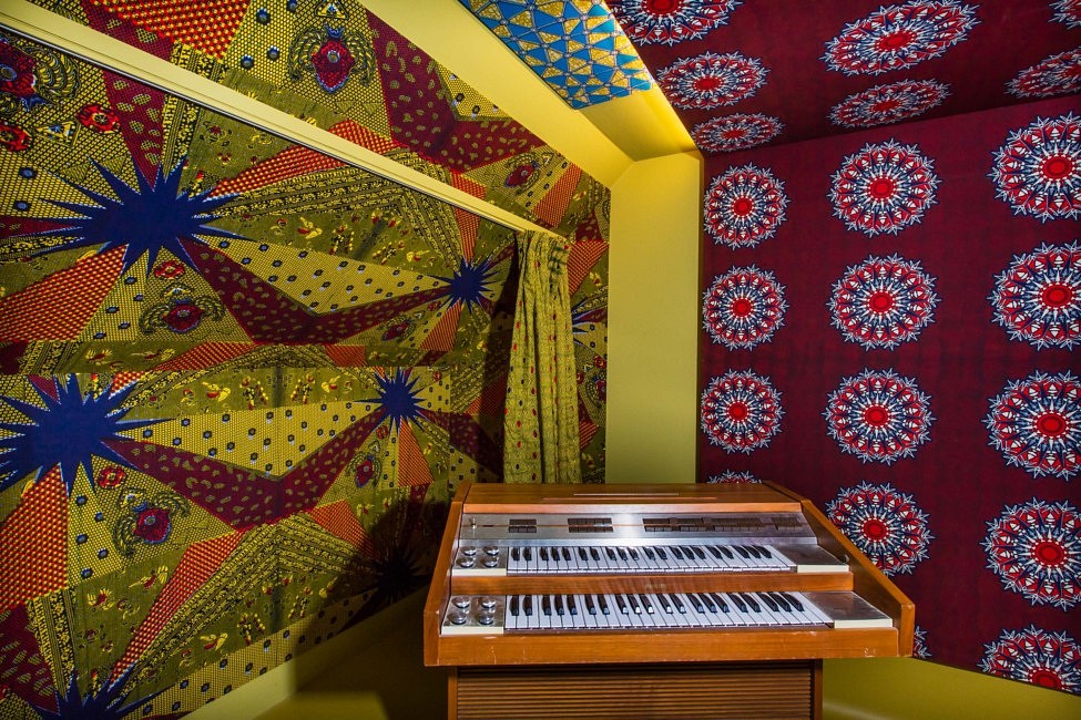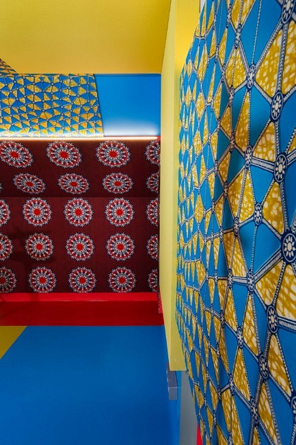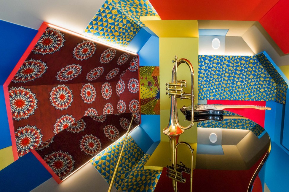 En collaboration avec l’acousticien Jean-Baptiste Prigl d’Ondel, il a été défini une répartition de panneaux absorbants, de diaphragmes et de surfaces réverbérantes. Sur cette base, un travail de combinatoire, véritable casse-tête chinois a été mené pour définir le calepin précis des panneaux. Lors d’une première tranche, ce jeu de patch-work avait été réalisé dans des tons neutres, garantissant une ambiance calme. Pour cette seconde tranche, haute en couleur, le choix des matériaux et couleurs s’est inspiré des musiques d’Ethiopie.