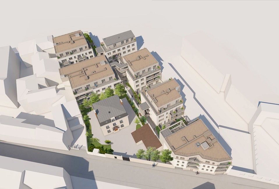 Le projet prévoit la construction de 69 logements collectifs répartis sur six bâtiments, articulés le long d’une ruelle intérieure paysagée. Elle est volontairement très lisible depuis l’espace public, par une large grille en serrurerie irrégulière, offrant une percée visuelle sur l’emble de la parcelle, et les espaces paysagers. Ce dispositif fait aussi écho au contexte, qui donne à voir par moment les cœurs d’îlot.