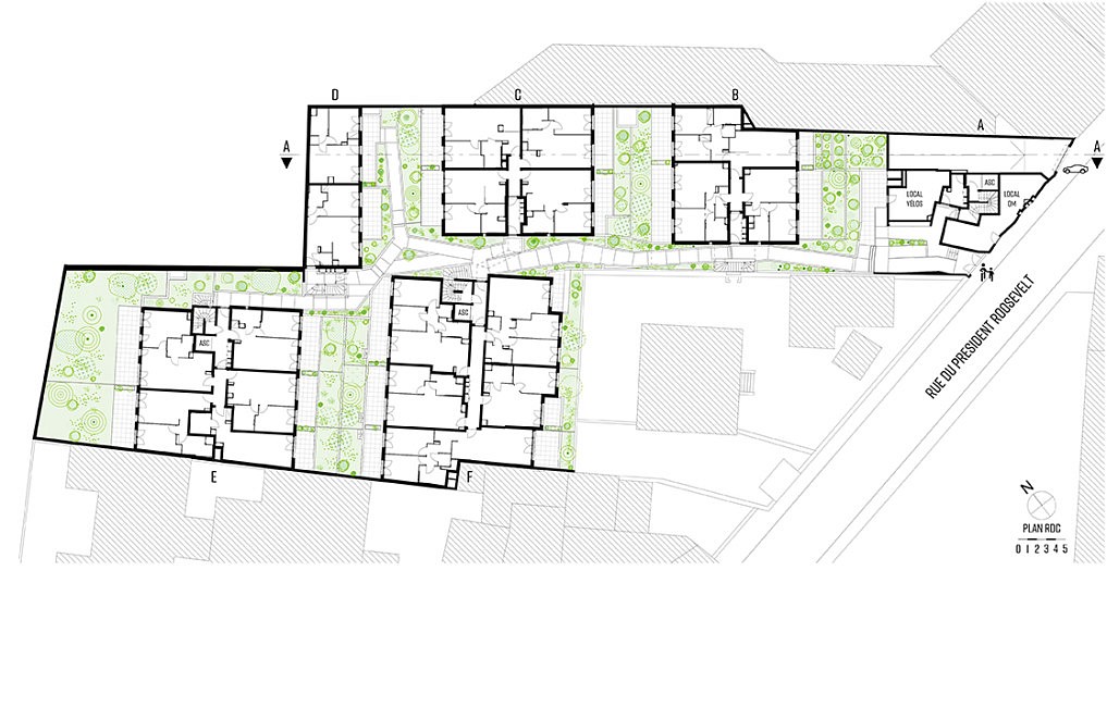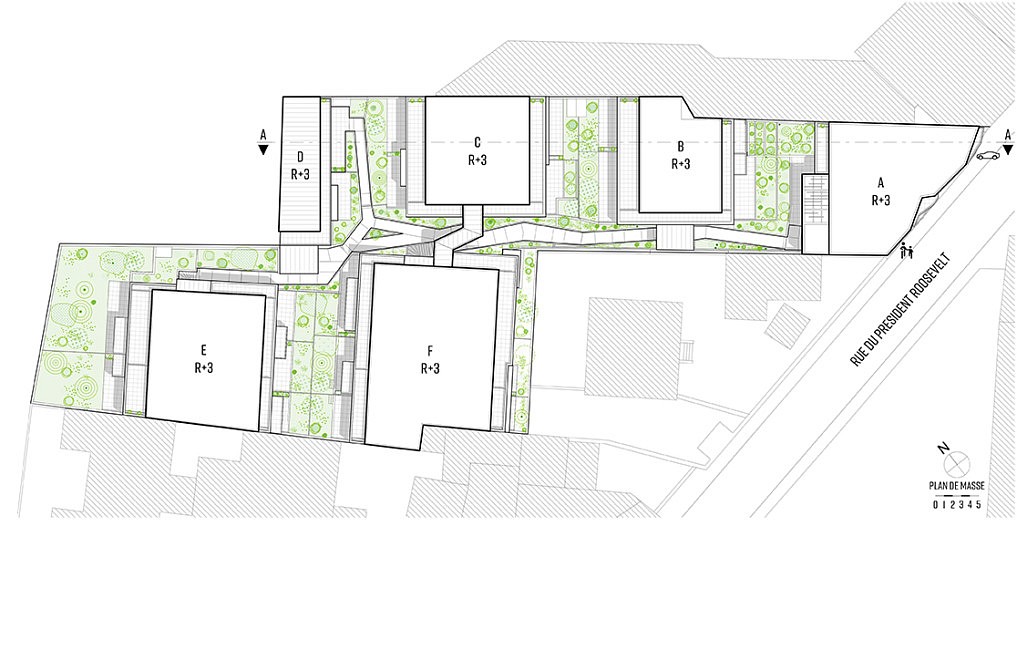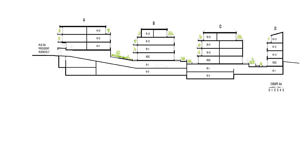 Le parcellaire présente un angle fort avec la rue du président Roosevelt, le bâti y est tantôt implanté à l’alignement, tantôt dans la direction du parcellaire, créant un second « pliage » sur la rue. Ce caractère est repris dans la morphologie du couronnement et des balcons sur rue, qui présentent des plis plus marqués, offrant une profondeur à la façade.