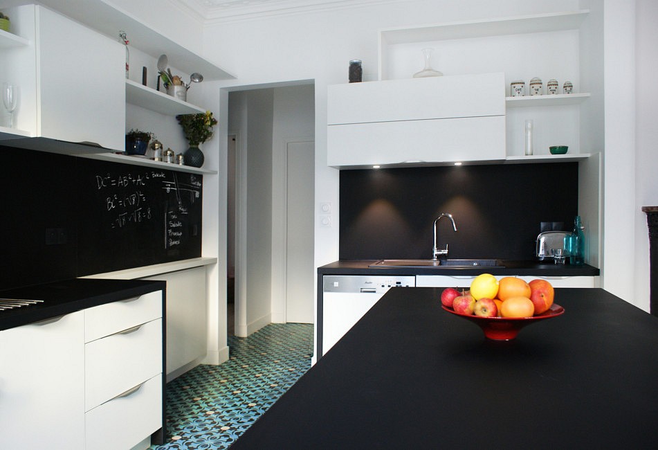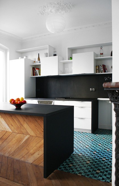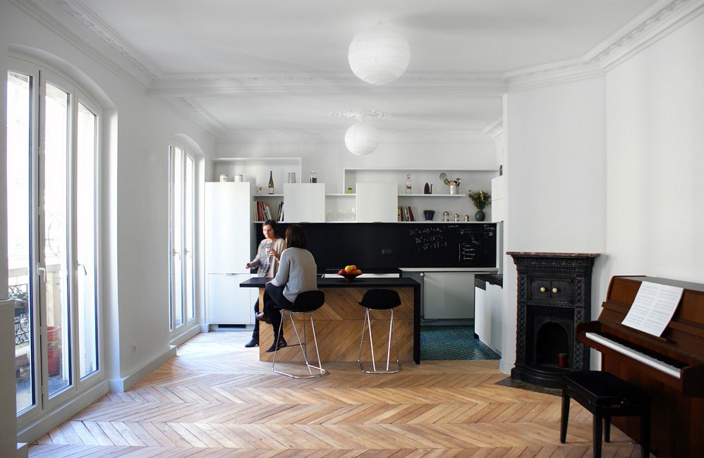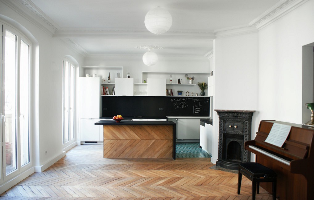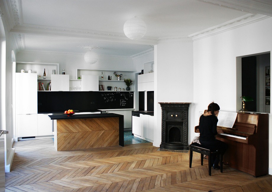 Le parquet existant a été réemployé en remonté sur l’ilot de cuisine, dans un effet de pliage de l’élément.