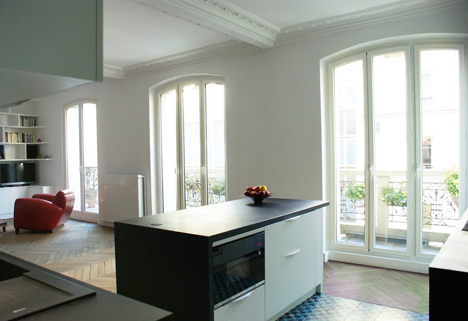 Pour cette réunion de 2 appartements en 1 à Paris, l’enfilade des ouvertures a été privilégiée pour redonner sa noblesse au lieu.