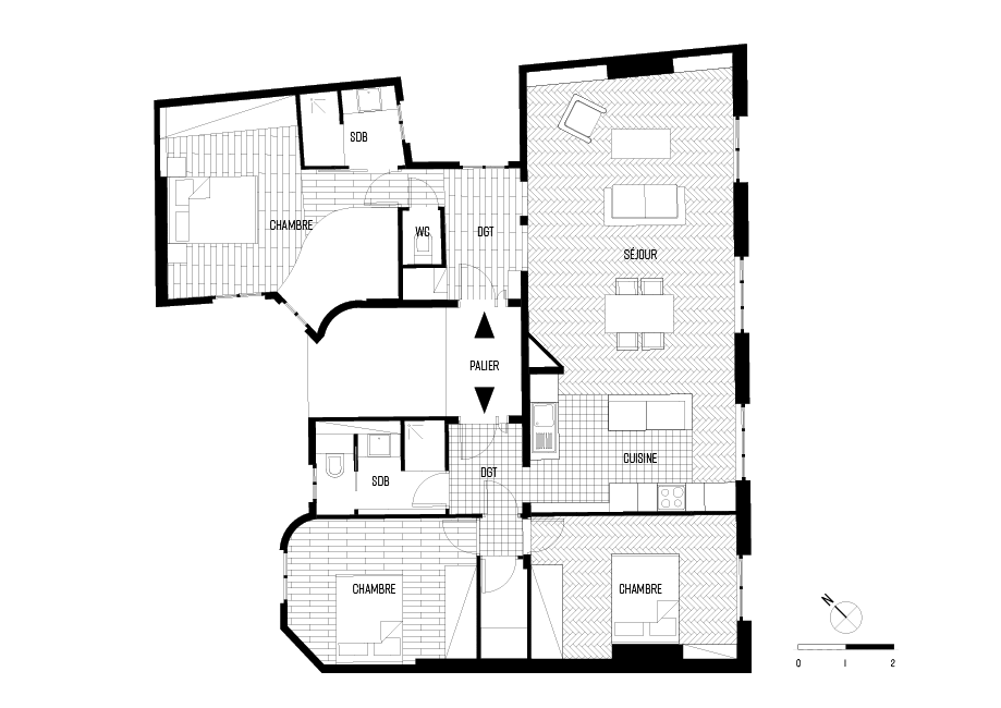 Un travail de composition et de mise en valeur des matériaux existants a été accompli pour mêler ancien et contemporain.