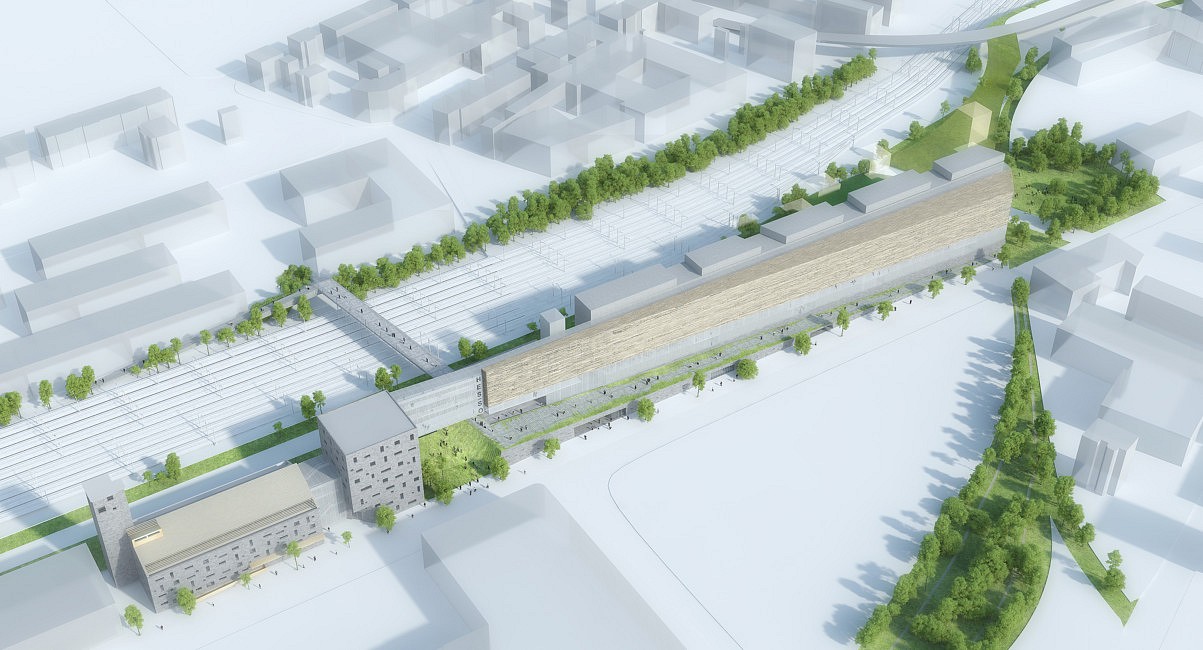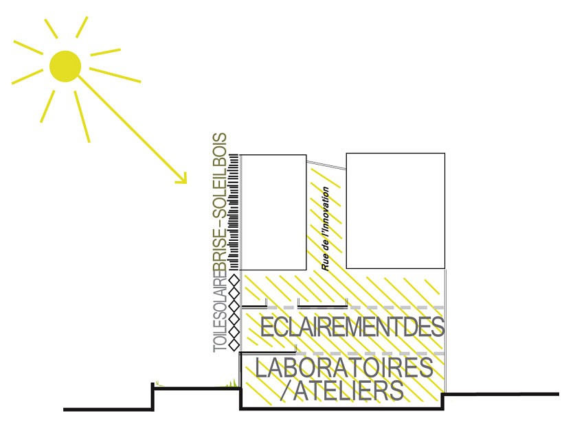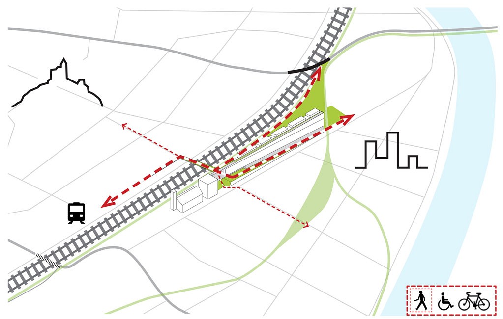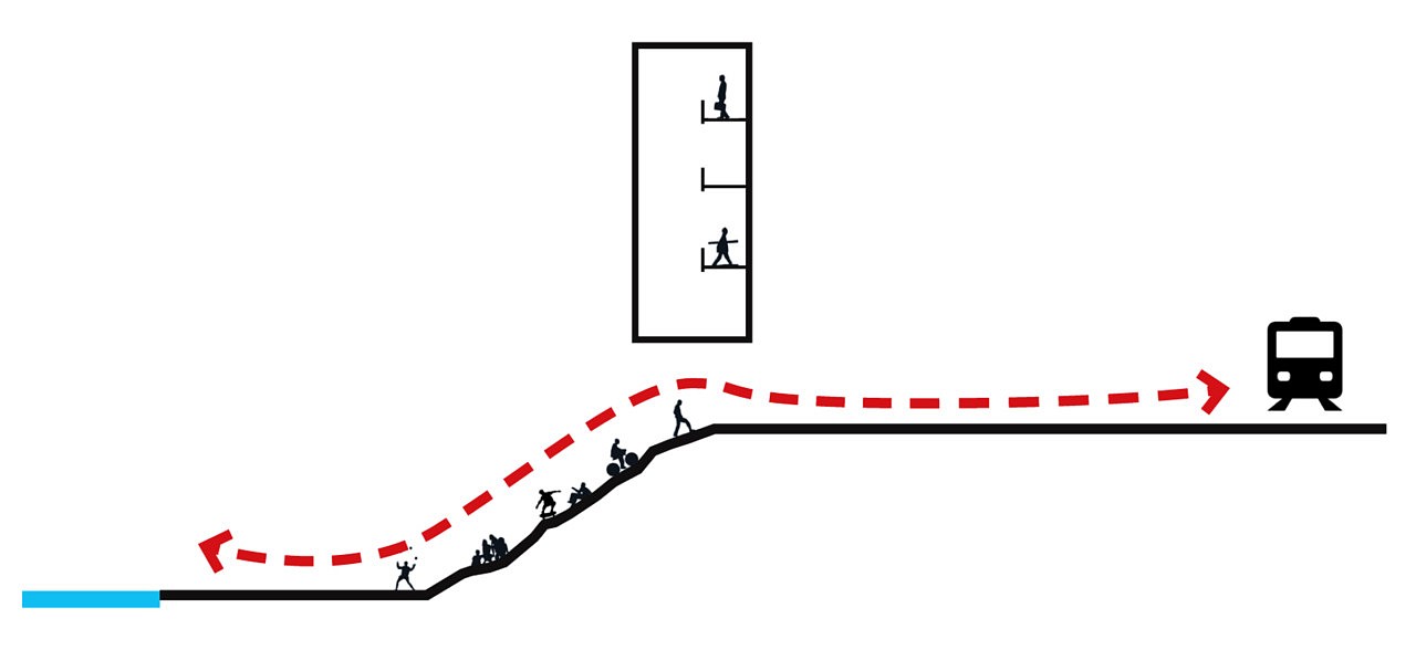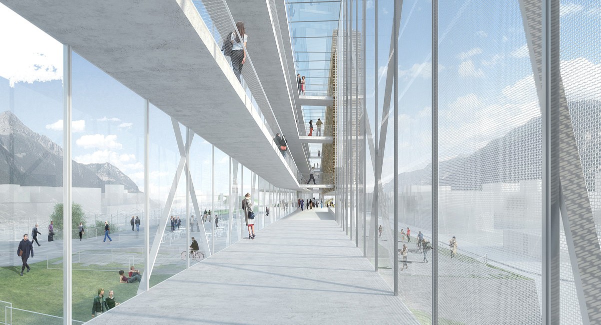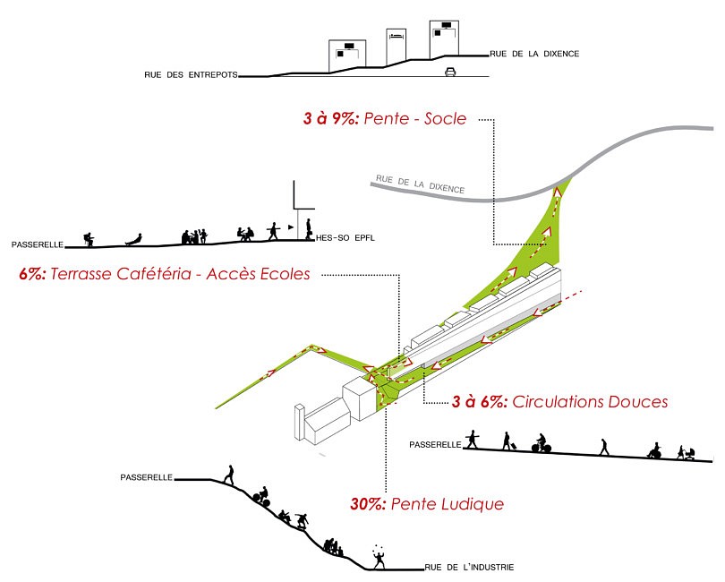 Ce projet est une réponse au Concours pour la construction du campus de l’Ecole Polytechnique Fédérale de Lausanne, lancé par le Canton du Valais, en Suisse. Le site est situé au cœur de la ville de Sion, en bordure de voies ferrées. Celle-ci constitue un élément structurant de la ville, confrontée à des obstacles qui, néanmoins, l’irriguent: fleuve et chemin de fer. Leur franchissement pose question. S’ils sont vécus a priori comme une contrainte par les usagers comme pour les concepteurs, ils représentent en réalité un formidable potentiel d’inventivité, de fabrique de la ville: décollement, surplomb, plongée, contreplongée…sont autant d’événements urbains ainsi générés. Notre parti-pris est d’accepter cette césure : ici, le bâtiment du campus opère le franchissement des voies de chemin de fer, connectant la rive nouvelle à la rive ancienne de la ville de Sion. La topographie issue de cette ascenSion offre de multiples façons d’arpenter le projet et de créer des porosités visuelles: de la pente la plus douce (3%) à la plus raide (30%), de la plus publique à la plus privée, de la plus «naturelle» à la plus sophistiquée. Par exemple, à l’intérieur du bâtiment, via une rampe, l’exposition se développe avec ampleur depuis l’entrée basse et vers l’entrée haute. A plus long terme (horizon 2030), un grand mouvement de «décollement» du sol reliera le campus et la passerelle à la rue de la Dixence. Ce socle en pente accueillera les infrastructures et équipements nécessaires à un développement encore incertain. Le campus s’installe dans ce nœud topographique, et jouit des événements urbains. La vie du campus et les habitants de Sion sont ainsi littéralement imbriqués dans ce qui sera l’opposé du modèle du campus universitaire autarcique. Le choix des matériaux mis en œuvre est issu de l’ancrage du projet dans le territoire. La pente permettant d’accéder depuis la rue vers la passerelle, traitée «naturellement», est soutenue par un mur en pierres sèches du Valais. Le bâtiment est habillé d’une vêture bois ajourée, brisant le soleil du Sud.